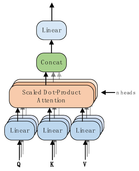 where WQ, WK and WV are weight matrices for Query, Key and Value. The multi-head attention mechanism consists of multiple heads, where multiple sets of attention are concatenated and weighted, each focusing on different positions in the sequence. The process is shown in Figure 4. In EmbTCN-Transformer, there are 8 heads.