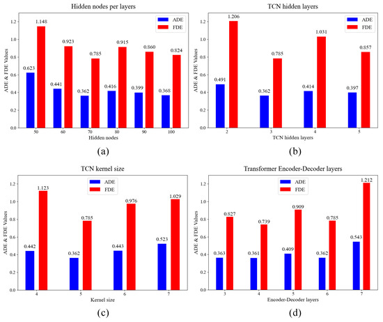 From Figure 5a, it is evident that as the number of nodes per hidden layer in the TCN increases, both ADE and FDE decrease and reach their minimum when the number of hidden nodes per layer arrives 70. However, further increases in hidden nodes result in overfitting, particularly in the FDE metric. Set the number of hidden nodes to 100. Although the difference in ADE compared to when there are 70 hidden nodes is minimal (less than 1%), there is still a significant gap in the FDE metric. Figure 5b demonstrates that a moderate increase in the number of hidden layers in the TCN contributes to improved prediction accuracy, with the optimal performance achieved when the number of hidden layers is six. However, an excessive number of hidden layers leads to model overfitting, diminishing model stability. According to Figure 5c, the impact of the TCN’s convolutional kernel size on model performance is more pronounced. Both excessively large and small kernel sizes noticeably affect network performance, with the best results achieved when the kernel size is five. As depicted in Figure 5d, a single-layer encoder–decoder structure has a large parameter count, and variations in the number of layers in the encoder and decoder have the most significant impact on model performance among the four parameters. The optimal performance is achieved when the number of encoder and decoder layers is four. This is because, compared to the Transformer, whose number of encoder and decoder layers is six, the EmbTCN-Transformer replaces the linear layer in the input embedding with TCN, resulting in an increased parameter count. Reducing the number of encoder and decoder layers is necessary to avoid severe overfitting.