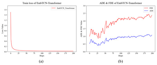 Results of EmbTCN-Transformer. (a) Training set loss values; (b) test set ADE and FDE values.
