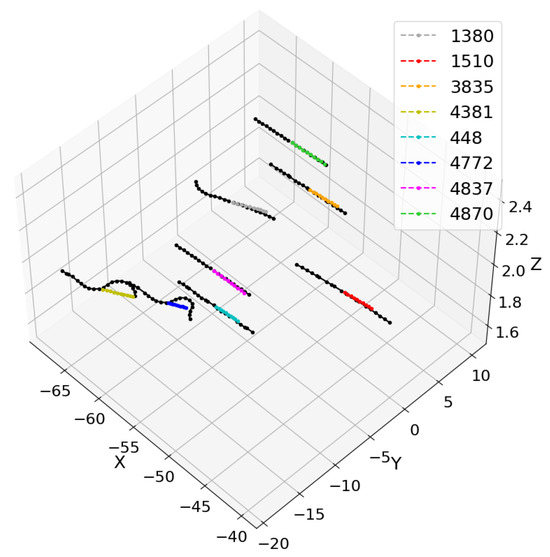 Figure 7 reveals that trajectory prediction aligns well with the overall direction and velocity forecasts of fighter UAV trajectories. Figure 8 depicts a forming trapezoidal fighter formation, with two UAVs in the front and five in the rear. The trajectory prediction is generally accurate for UAVs flying straight or engaged in minor maneuvering within the fighter formation. Notably, for the UAV number 1380, the trajectory prediction accurately maintains the direction and velocity after maneuvering. However, for UAV numbers 4381 and 4772, both are engaged in substantial maneuvers to adjust their positions and attitudes within the formation. The model can only predict a portion of their maneuvers or small-scale maneuvers, indicating a limitation in the overall predictive capability for extensive and comprehensive maneuvers.