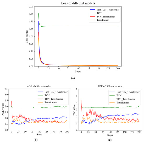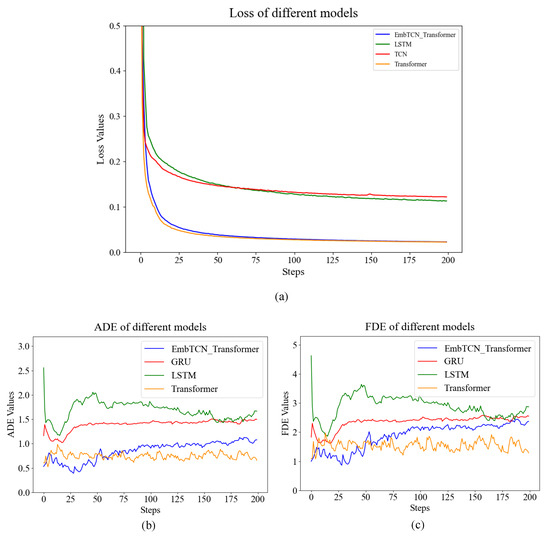 Experimental results of EmbTCN-Transformer and baselines. (a) Training loss of different models; (b) ADE of different models; (c) FDE of different models.