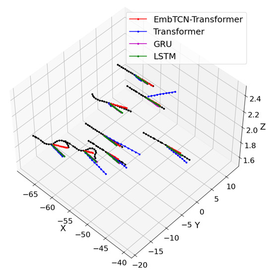 From Table 4, it is evident that both metrics for EmbTCN-Transformer are lower than the other three models. Compared to TCN and Transformer, the EmbTCN-Transformer exhibits an 80%, 30% and 24% reduction in ADE, and a 77%, 27% and 15% reduction in FDE, respectively. Meanwhile, the EmbTCN-Transformer demonstrates a slightly improved performance compared with the TCN-Transformer, achieving a 24% reduction in ADE and a 15% reduction in FDE, indicating that the improvement achieved through our modifications cannot be realized by a simple concatenation of the two networks. This underscores the significant performance enhancement achieved by incorporating convolutional operations in the input embedding module, introducing information about different positions in the time series to the Transformer network.
