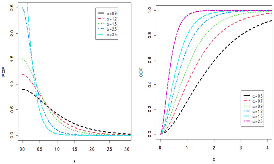 Shapes of the PDF and CDF of IALD for various values of α.
