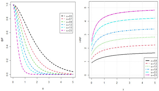 Shapes of the SF and HRF of IALD for various values of α.