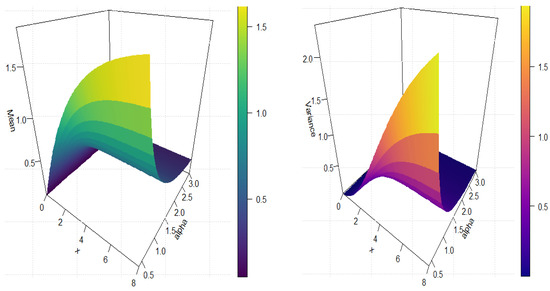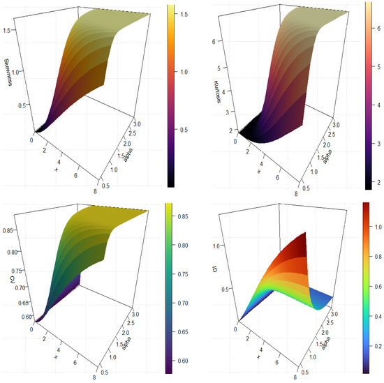 Table 1 provides detailed numerical data for significant statistical moments and parameters associated with the IALD. The results encompass variance (), standard deviation (SD), index of dispersion (ID), and the initial four moments , , , and . The values of the moments decrease as increases, signifying alterations in the model’s distribution. This underscores the model’s sensitivity to these critical parameters and their impact on the outcomes. For additional explanation, Figure 3 presents three-dimensional representations of key statistical measures of the IALD, including the mean, variance, , Sk and .