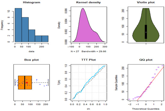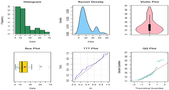 Table 9 primarily examines the two datasets. Figure 4 and Figure 5 present graphical summaries of the datasets through quantile–quantile (QQ) plots, violin plots, box plots, histograms, kernel density estimates, and total time on test (TTT) plots. The results suggest that the first dataset follows a right-skewed, non-normal distribution with the presence of outliers and a bathtub-shaped hazard rate function (HRF). Similarly, the second dataset also displays right skewness, several outliers, and a bathtub-shaped HRF. The IALD, as established in the theoretical findings, can accommodate these properties.