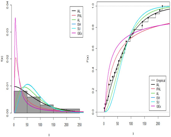 This comparative analysis thoroughly assesses the IALD against several competing models, namely the Ailamujia (AL) [17], inverse power Ailamujia (IPAL) [25], Ishita (ISH) [41], generalized inverted exponential (GIEx) [42], and Sujatha (SU) [43] distributions. Parameter estimation and goodness-of-fit assessments were conducted using the maximum likelihood method within the R programming environment. The parameter estimates and their standard errors are reported in Table 10 and Table 11.