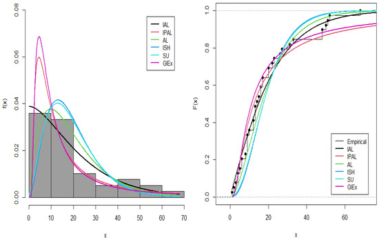 Model selection was based on a range of statistical criteria, including the Akaike information criterion (S1), Bayesian information criterion (S2), corrected Akaike information criterion (S3), Hannan–Quinn information criterion (S4), Kolmogorov–Smirnov distance (S5) with associated p-value (S6), and the Cramér–von Mises statistic (S7). As shown in Table 12 and Table 13, the IALD outperforms all competitors, achieving the smallest values for S1, S2, S3, S4, S5, S6, and S7, along with the largest value of S6. Additionally, graphical comparisons are presented in Figure 6 and Figure 7, which display fitted densities, empirical cumulative distribution functions, and P–P plots, while Figure 8, Figure 9, Figure 10, Figure 11, Figure 12 and Figure 13 offer visual comparisons of the two datasets with their corresponding fitted PDFs, CDFs, and P–P plots.