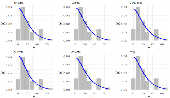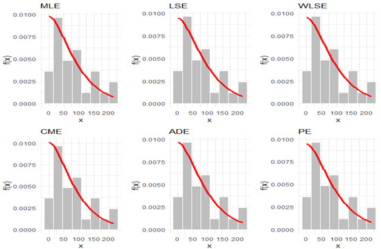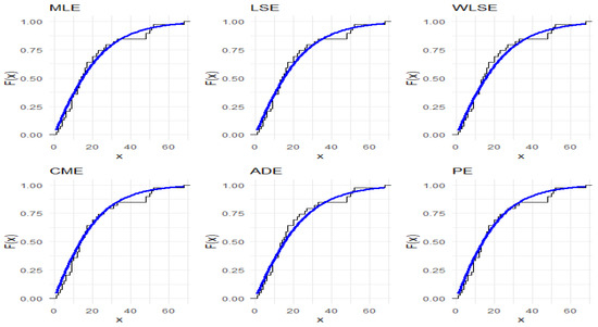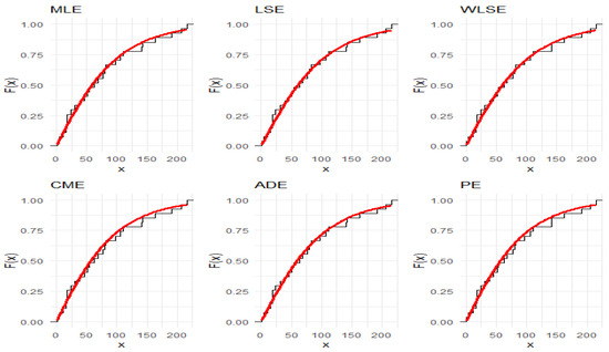 Six conventional techniques for estimating the parameter of the IALD are examined in this section. To obtain the most appropriate estimations, these estimating techniques maximize or minimize an objective function. These methods are the maximum likelihood (V1), least squares (V2), weighted least squares (V3), Cramér–von Mises (V4), Anderson–Darling (V5), and percentile (V6).