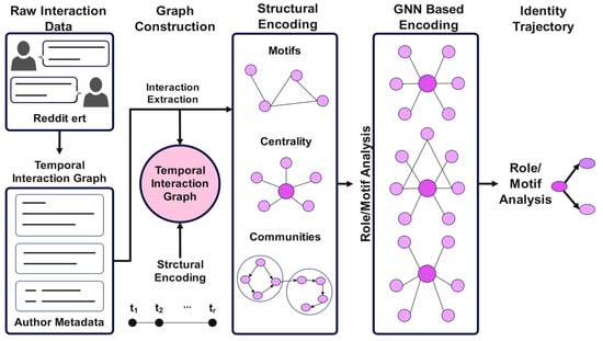 To reflect the dynamic and emergent characteristics of AI identity, the proposed work suggests an orderly, network-oriented modelling framework that incorporates temporal graph construction, structural encoding, and representation learning using Graph Neural Networks (GNNs). The general principle here is to tie agents to nodes in changing interaction graphs, such that identity is constructed through roles, behaviors, and structural positioning in time. With the addition of motifs, centrality measurements, and community structures to these graphs, and the temporal GNNs embedded within this framework, the framework produces interpretable trajectories of identity. This approach enables the identification of stable and transitional roles, revealing how identity patterns are created as a result of social interaction and sequence. The modeling process consists of the following stages, which are described below. The given sequence will be used in conjunction with role stability, identity transitions, and structural influence, enabling interpretable and data-driven knowledge about the AI’s identity. The entire methodological pipeline used to construct and analyze identity through complex networks is shown in Figure 1. It begins with raw data on interactions, such as Reddit comment threads or author metadata, which is converted into a Temporal Interaction Graph of agents and temporally ordered interactions. They are encoded structurally to retrieve meaningful patterns such as motifs, centrality scores, and community structure, which give good context for the positioning of the agents. These structurally enhanced graphs are fed into Graph Neural Networks (GNNs), e.g., GCNs or GATs, to compute dynamic identity embeddings. Lastly, these embeddings are used to build identity trajectories that can be classified into roles, interpreted based on motifs, and studied in terms of identity emergence over time. The pipeline encompasses a relational structure and time evolution, providing a sound method for modeling the AI identity in dynamic multi-agent systems.