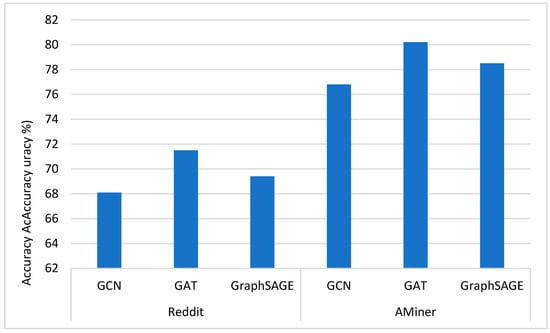 Supervised classification experiments, using community or research field labels as ground truth, are summarized in Table 4. GAT reaches the highest accuracy of 80.2% on AMiner and 71.5% on Reddit. Macro F1-scores are also higher across the board, suggesting that GAT preserves role-level differentiation more effectively than GCNs or GraphSAGE.