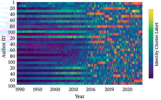 Finally, identity evolution over time is illustrated in Figure 4 using a heatmap of role assignments for the top 100 authors in AMiner. Stable horizontal patterns suggest consistent roles, while fragmented or sloped bands indicate identity transitions, often aligned with entry into new research fields.