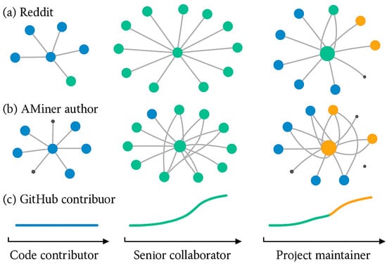 Qualitative examples of identity evolution across datasets: (a) Reddit—transition from initiator to moderator-like user, (b) AMiner—evolution from early-career researcher to senior collaborator, and (c) GitHub—progression from code contributor to project maintainer.