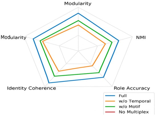 To summarize performance changes across all ablation types, a radar chart is provided in Figure 6. The full model dominates across all axes (modularity, accuracy, coherence, and NMI), while other configurations show radial shrinkage, especially when both motif and temporal layers are removed.