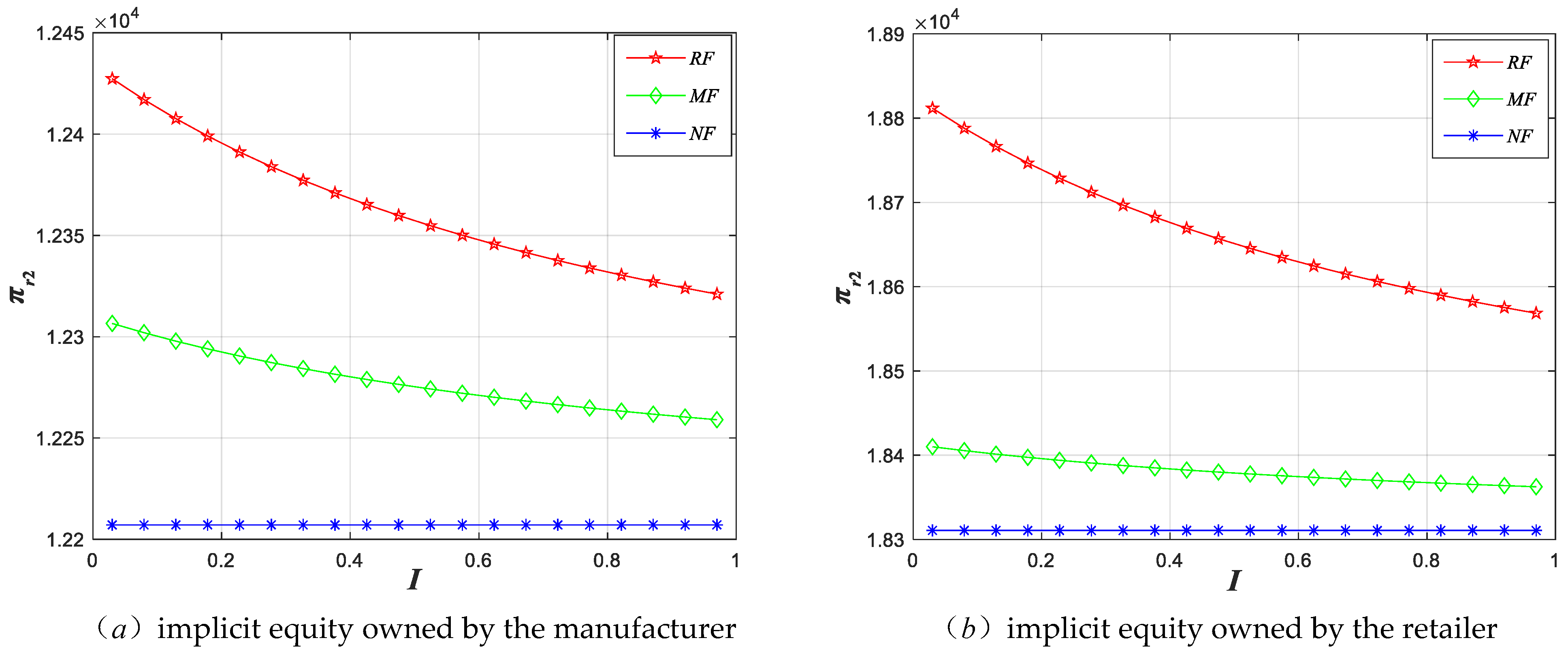 4.2.2. Green Supply Chain Financing Decision Model Based on Inter-Chain Competition Considering the Implicit Equity Value Owned by the Retailer
