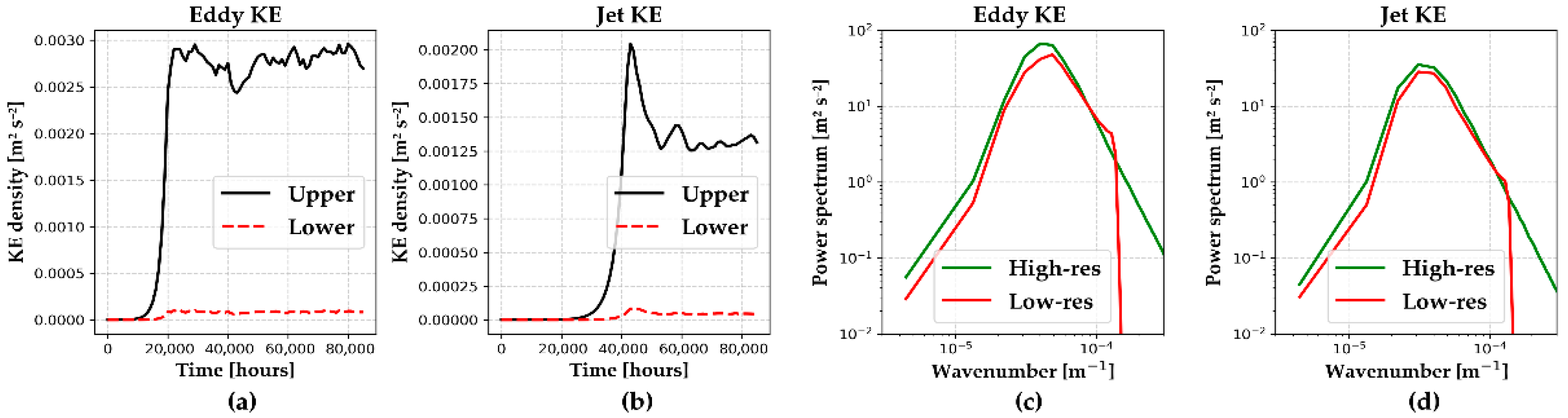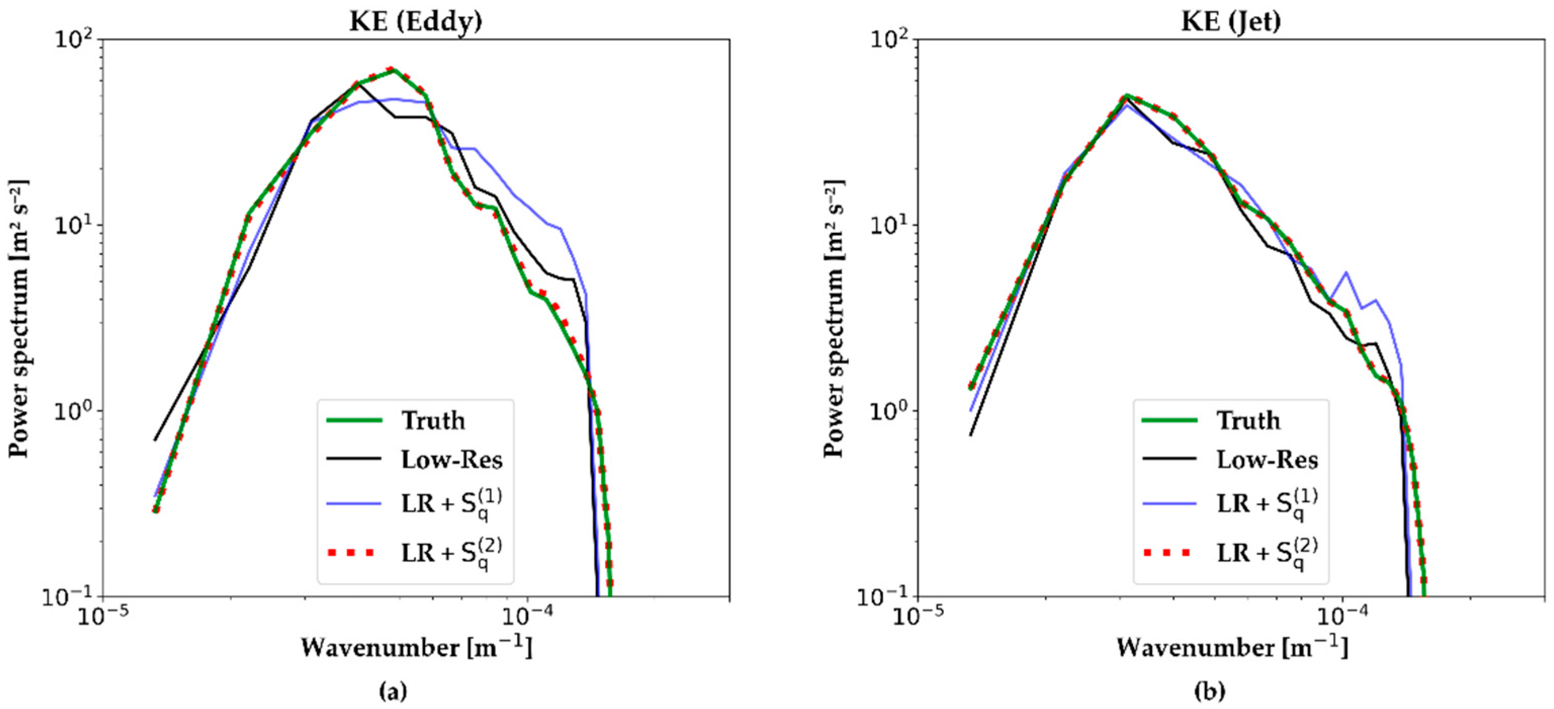 45]. By leveraging subgrid forcing derived from the nonlinear advection form, the developed data-driven parameterization schemes enhance KE at larger spatial scales, suggesting more efficient backscatter, while yielding insufficient KE at smaller scales, thus highlighting the likely role of viscous effects [