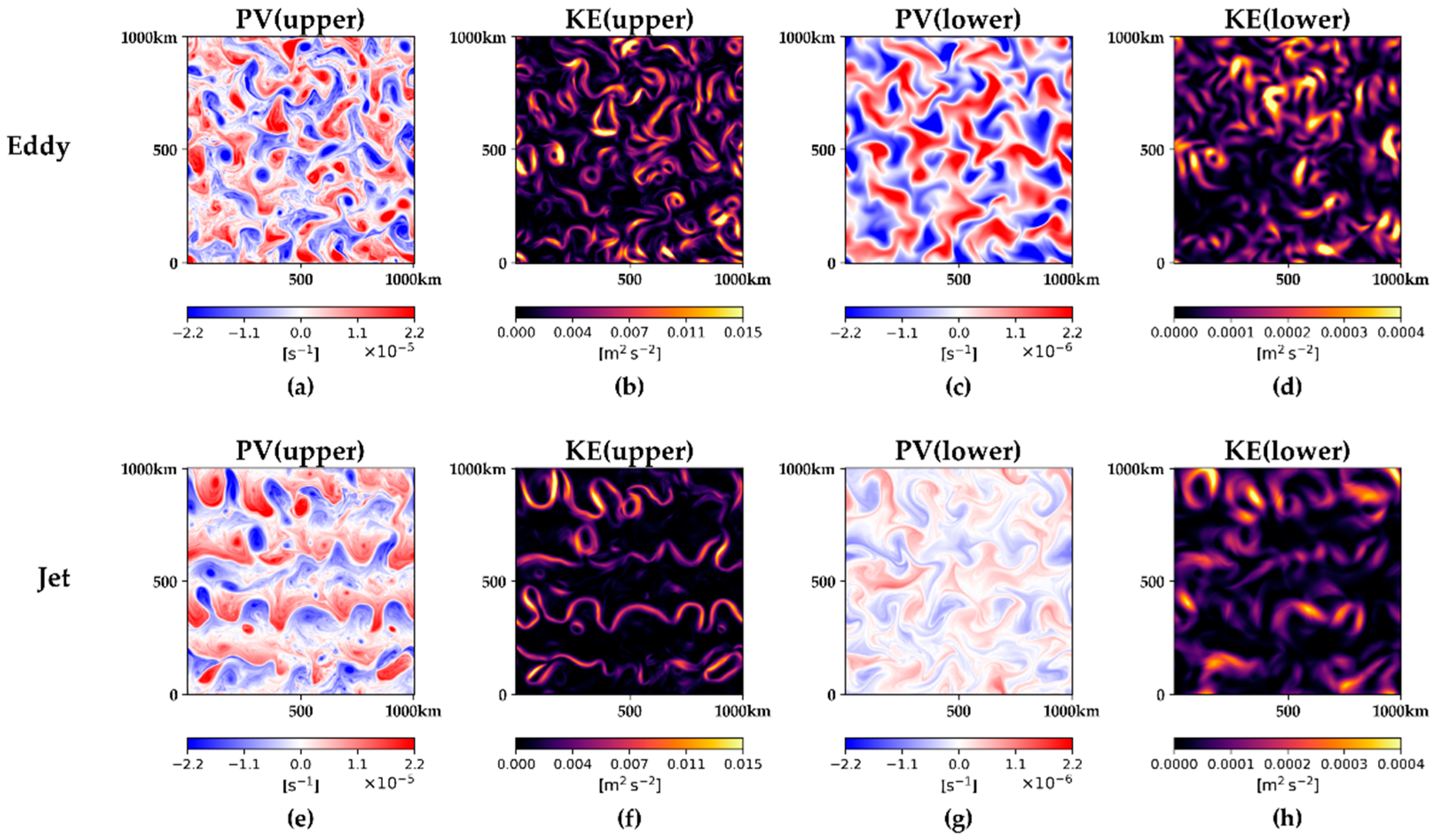 Section 3. The results for both the Eddy and Jet configurations at the 60,000th h of the 10-year simulations are presented in