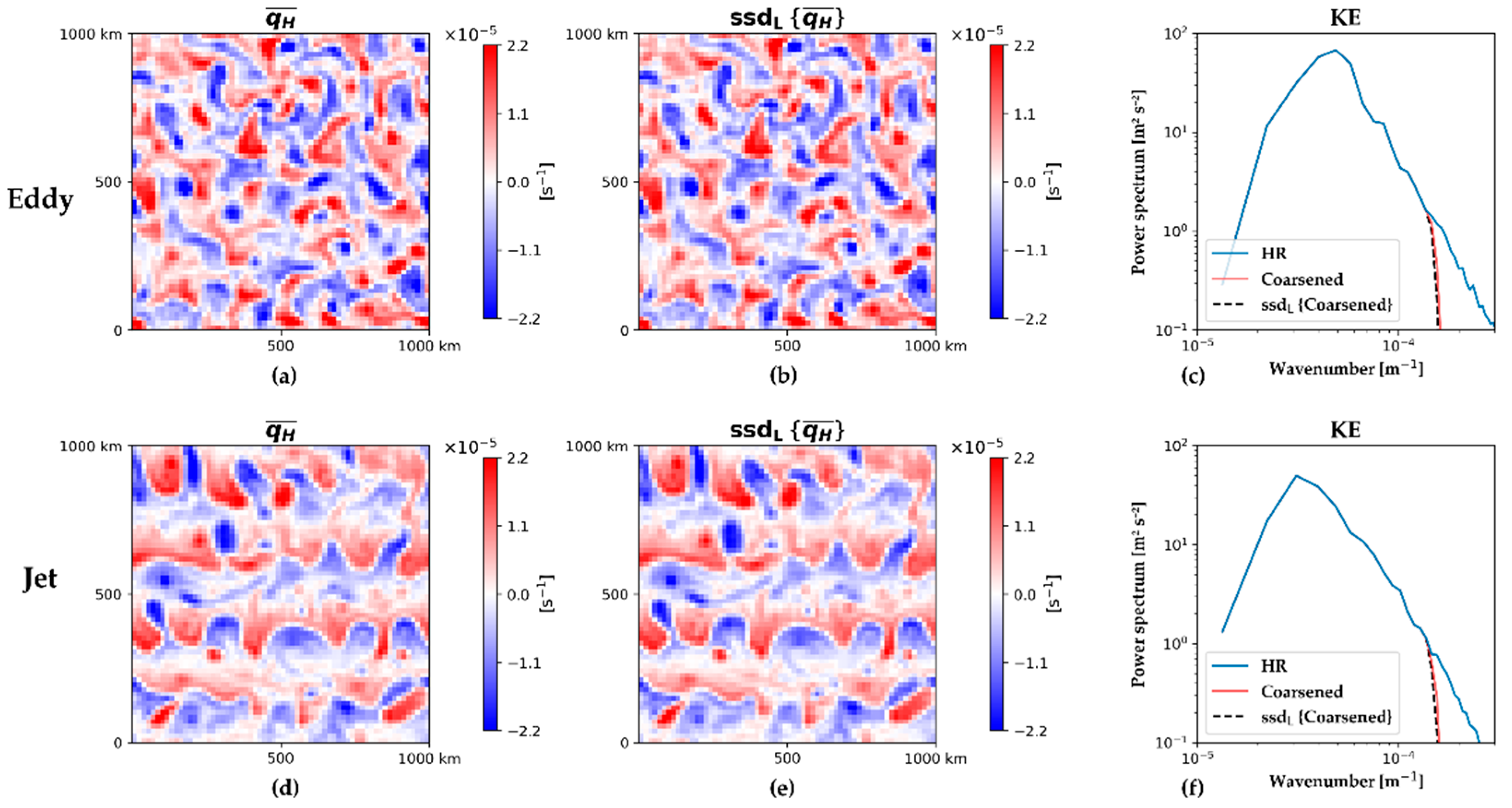 31], that incorporate physical processes beyond the mesoscale eddies and jets considered here, including submesoscale dynamics and wave–eddy interactions. Primitive equation models would be required to investigate the effects of important dynamical factors not considered in this study, including more complex vertical stratification, non-hydrostatic processes, and boundary layer dynamics. Although the derivation of the subgrid forcing may be similar, the relative importance of numerical dissipation compared to the physical effects of unresolved processes requires careful investigation in these specific contexts, since these processes have smaller spatial scales and evolve much faster than mesoscale eddies and jets. All these important directions will be systematically pursued in future studies. Ultimately, this work demonstrates that accurately extracting subgrid forcing from high-resolution simulations requires explicit consideration of the specific numerical discretization scheme employed.