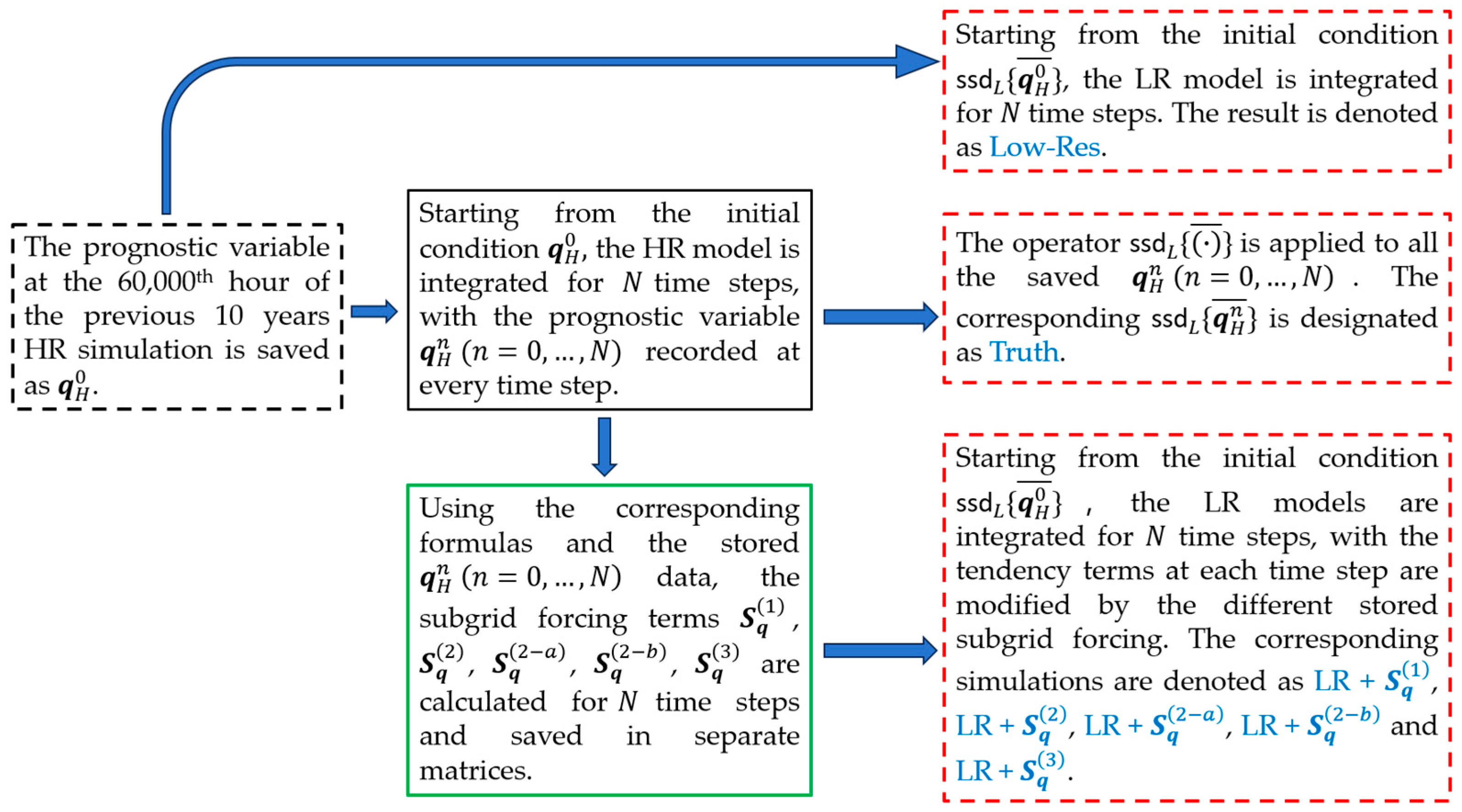 ) at each time step in advance. These are stored in the predefined matrices. During the LR simulations, the saved forcing values are applied to modify the evolution scheme at every time step. In practice, this is implemented in pyqg by replacing the standard parameterization scheme with the precomputed subgrid forcing matrix. The flowchart of these simulations is shown in