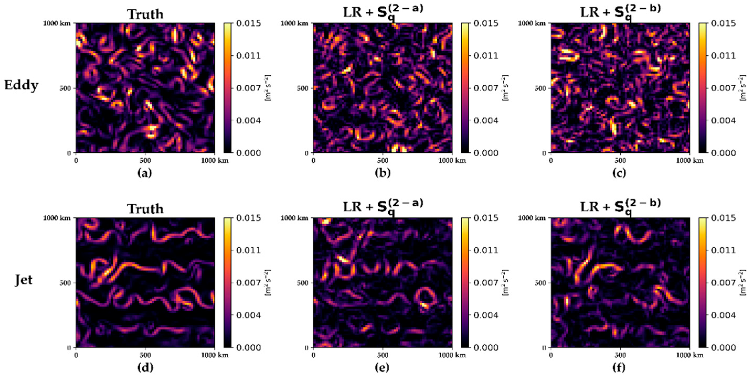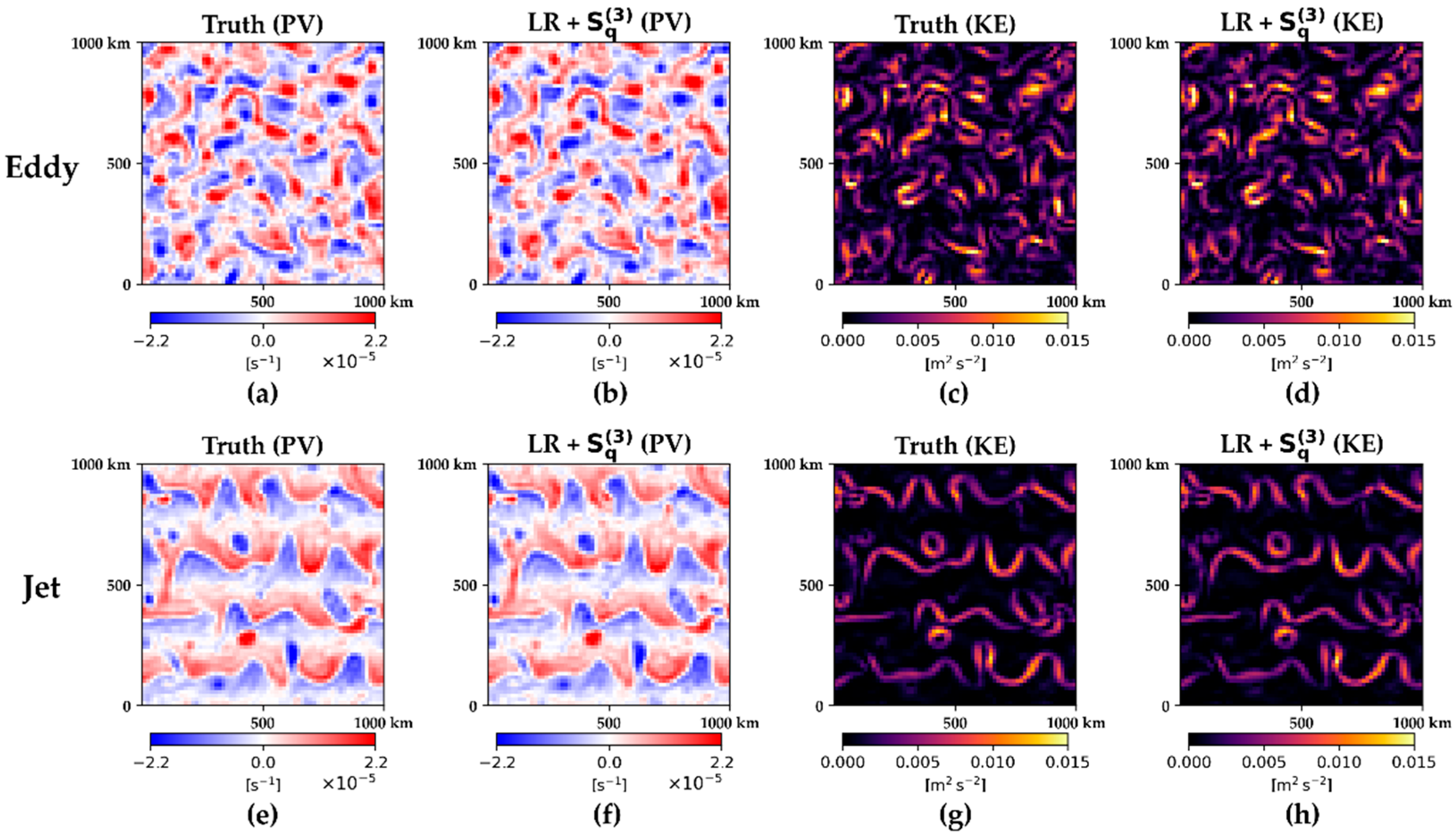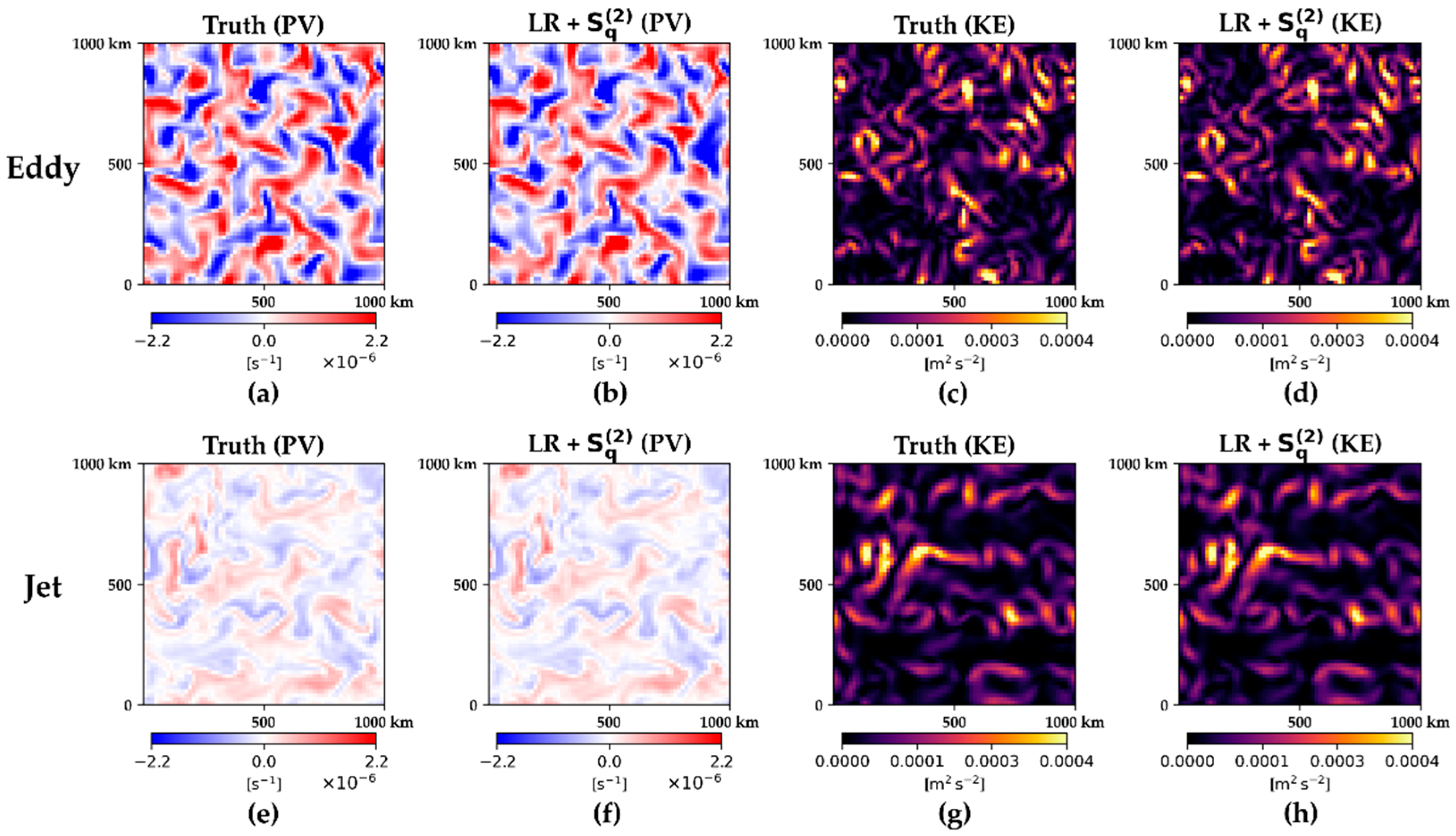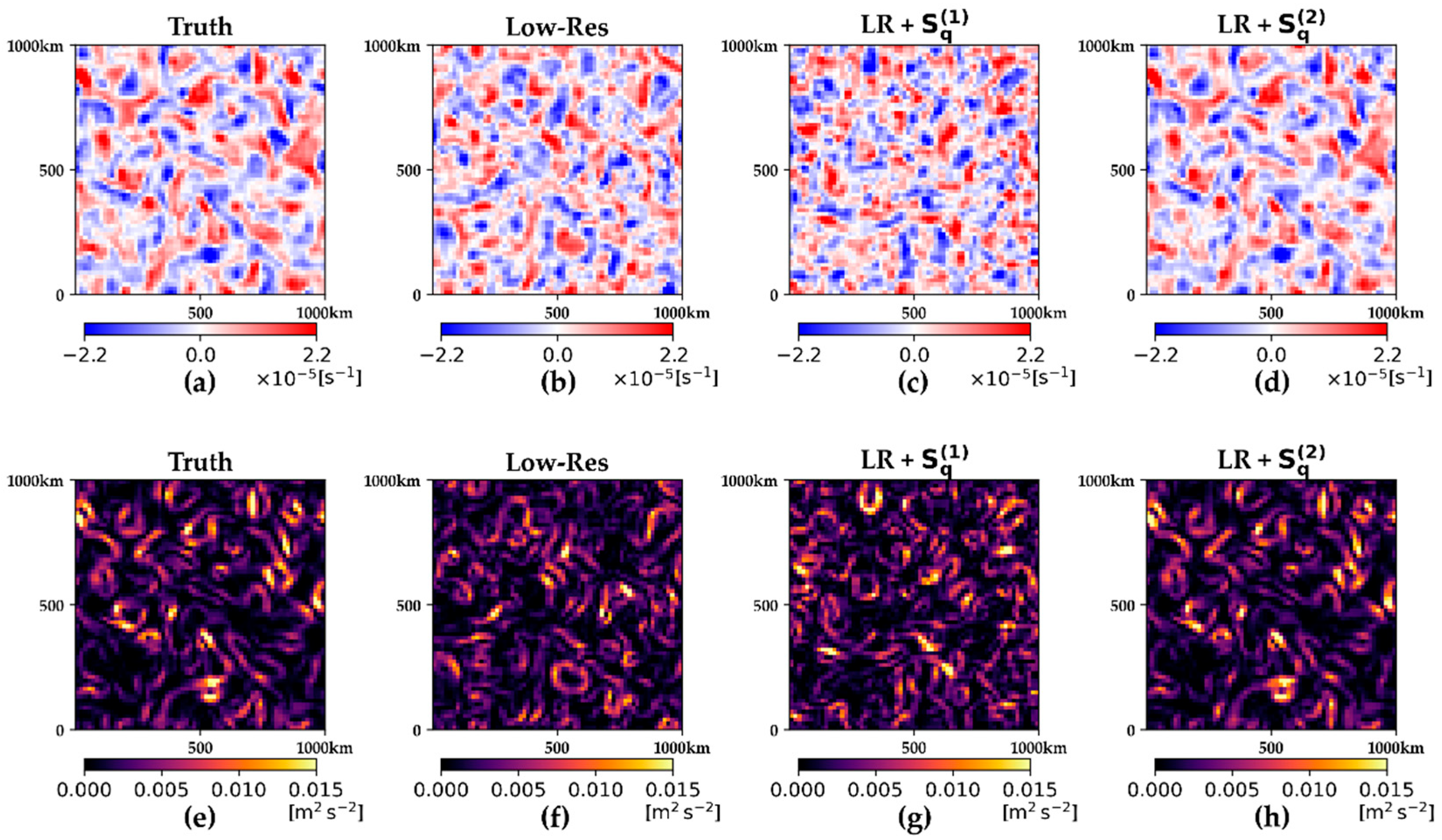 24], filtering is performed using the same quadruple-exponential filter employed for small-scale dissipation in Equation (3), while coarse-graining is carried out via spectral truncation of the spatial modes of the variables. For the downscaling from a resolution of 256 × 256 to 64 × 64, this process begins with a variable represented in Fourier space with 128 modes, of which only the first 32 are retained.