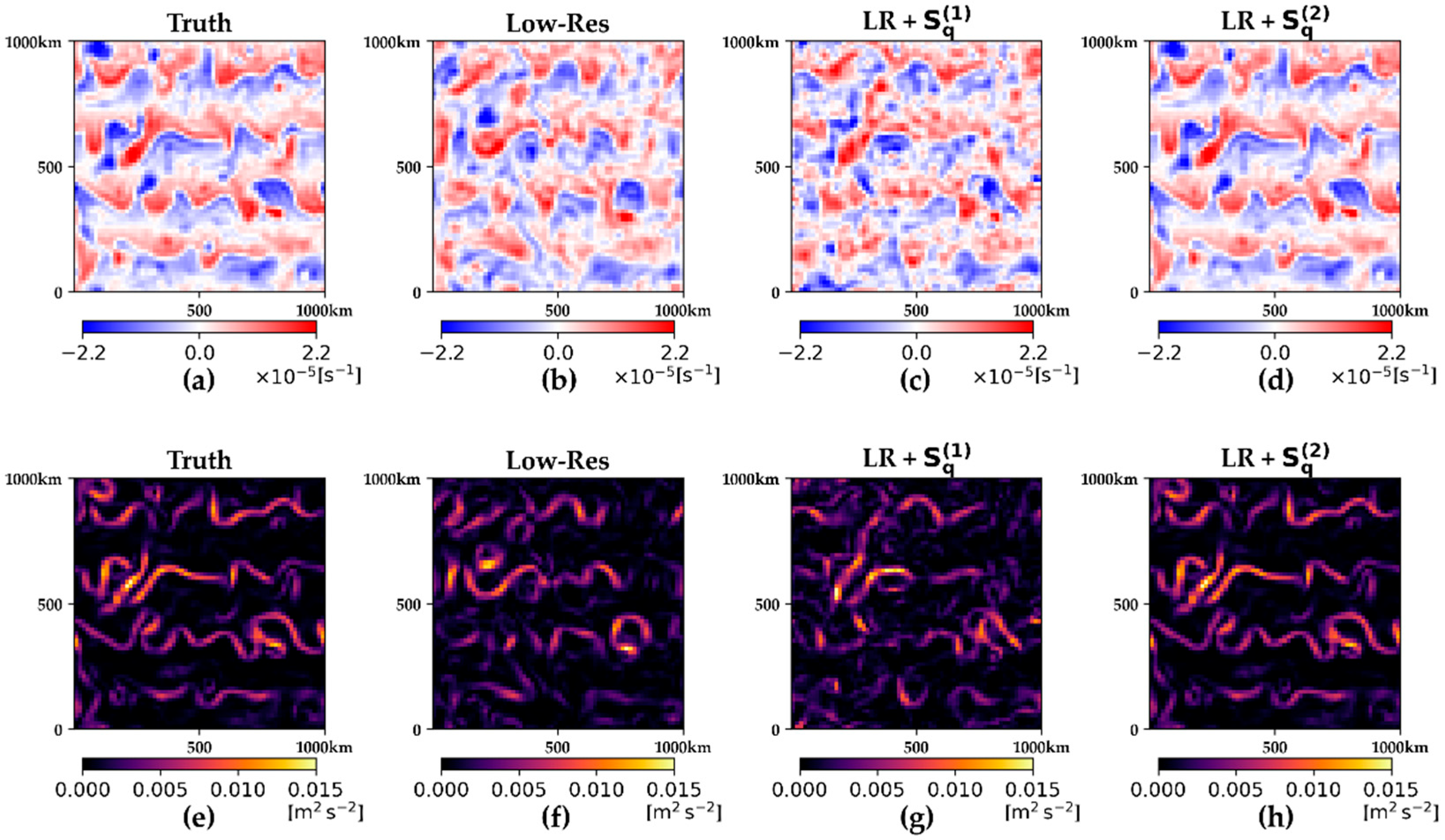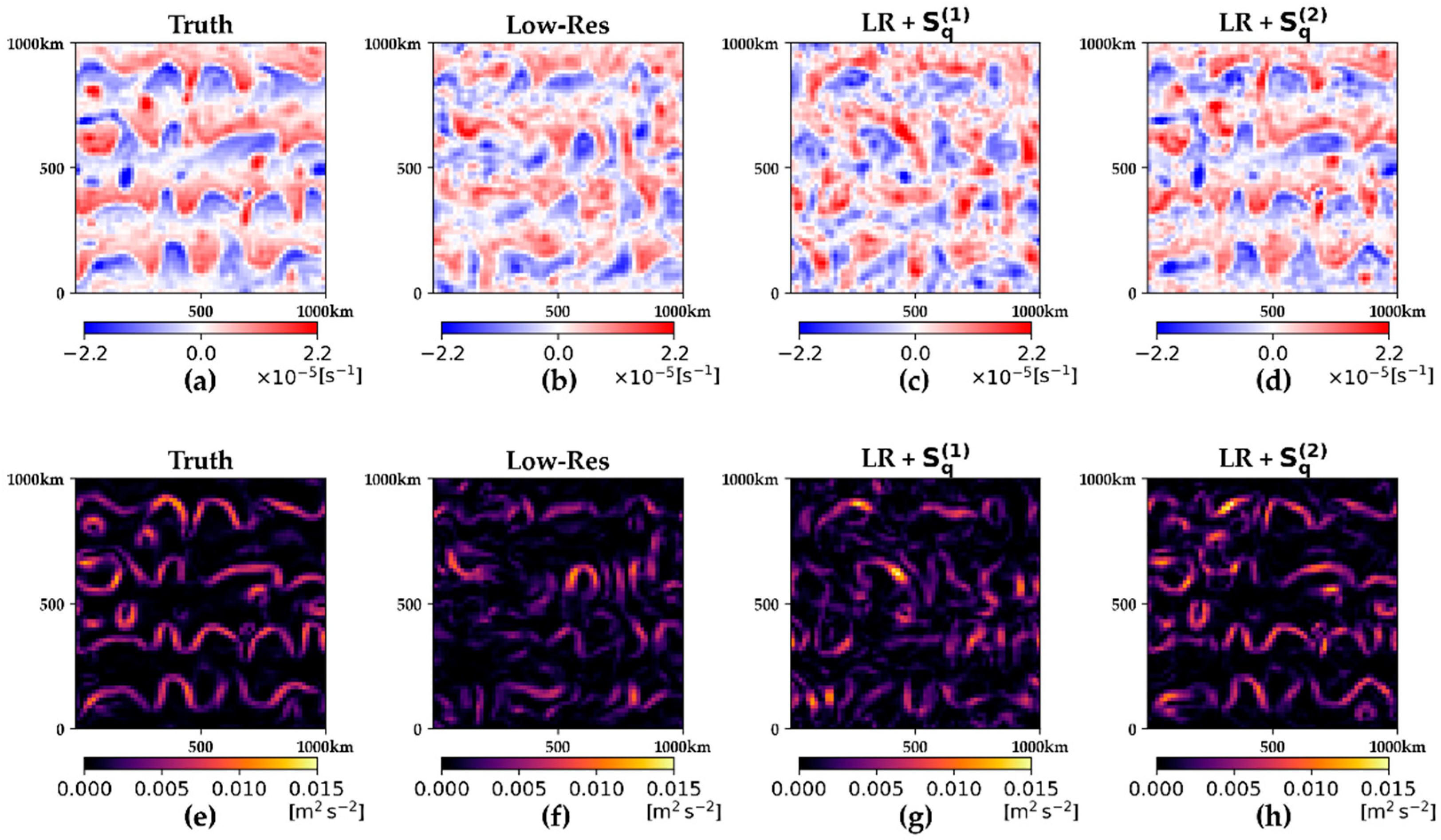 In the following, and denote the tendency terms computed using the same formulation as in Equation (4), but numerically evaluated on the HR and LR grids, respectively, with different wavenumber cutoffs in de-aliasing and ssd filters.