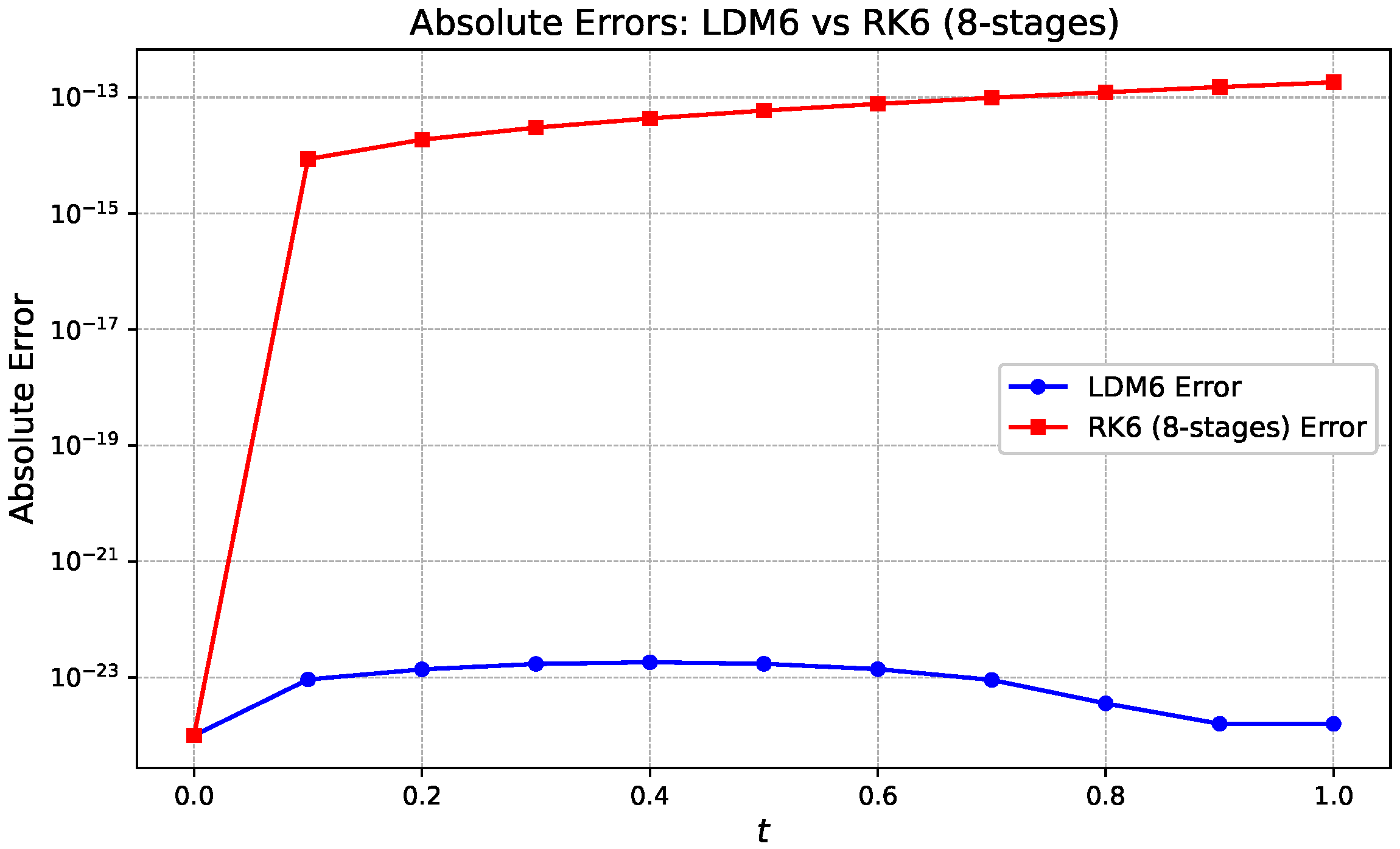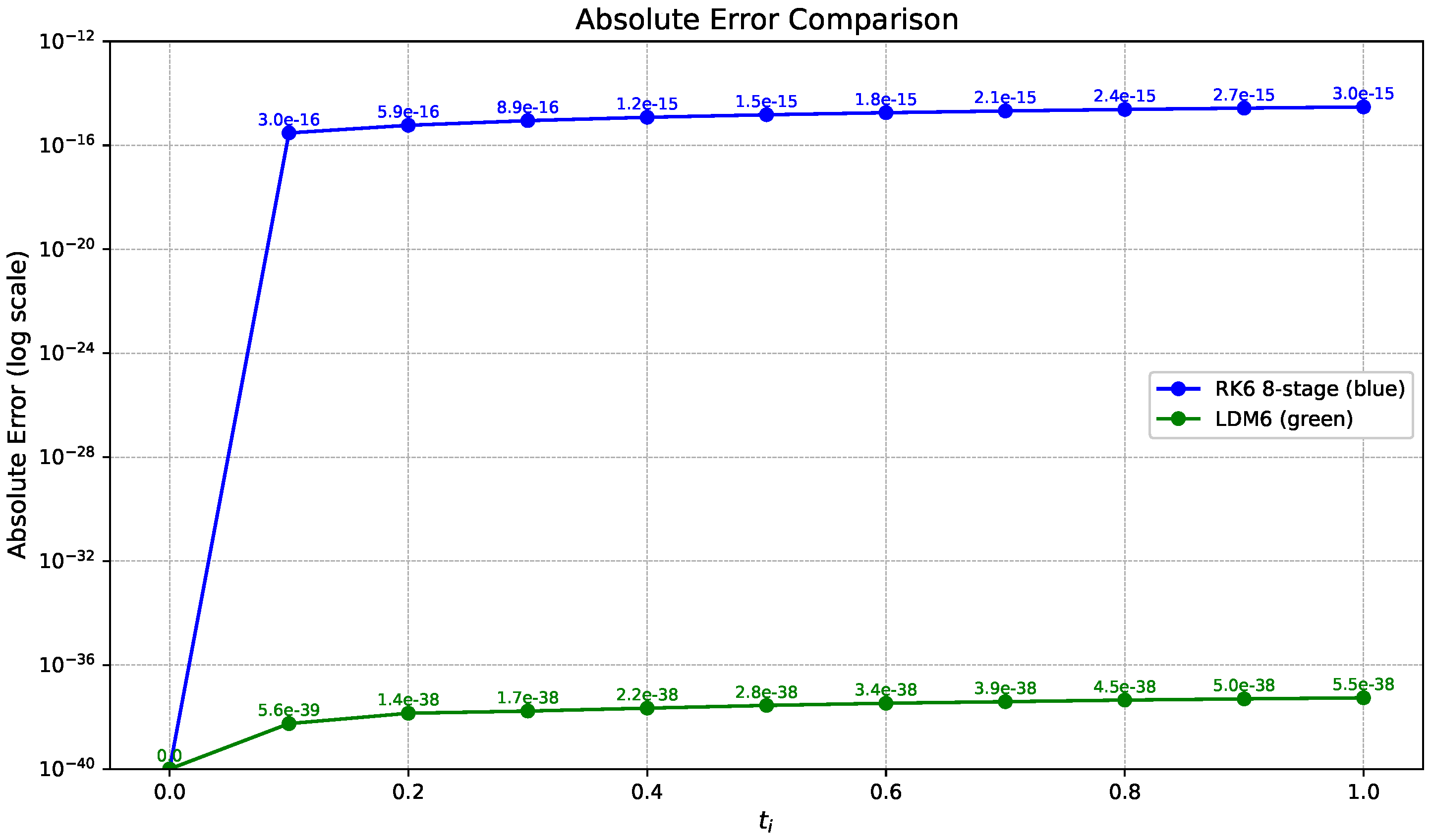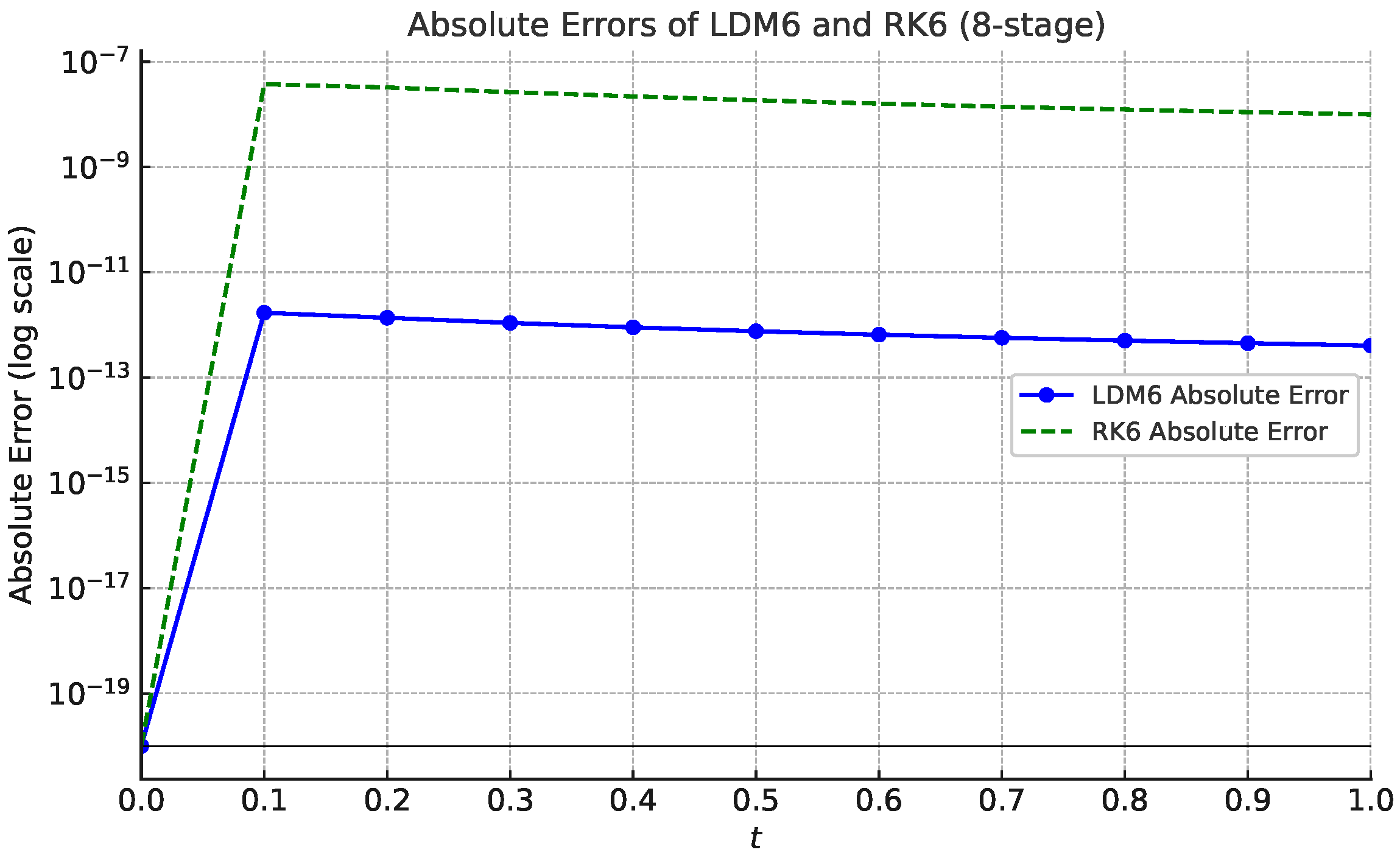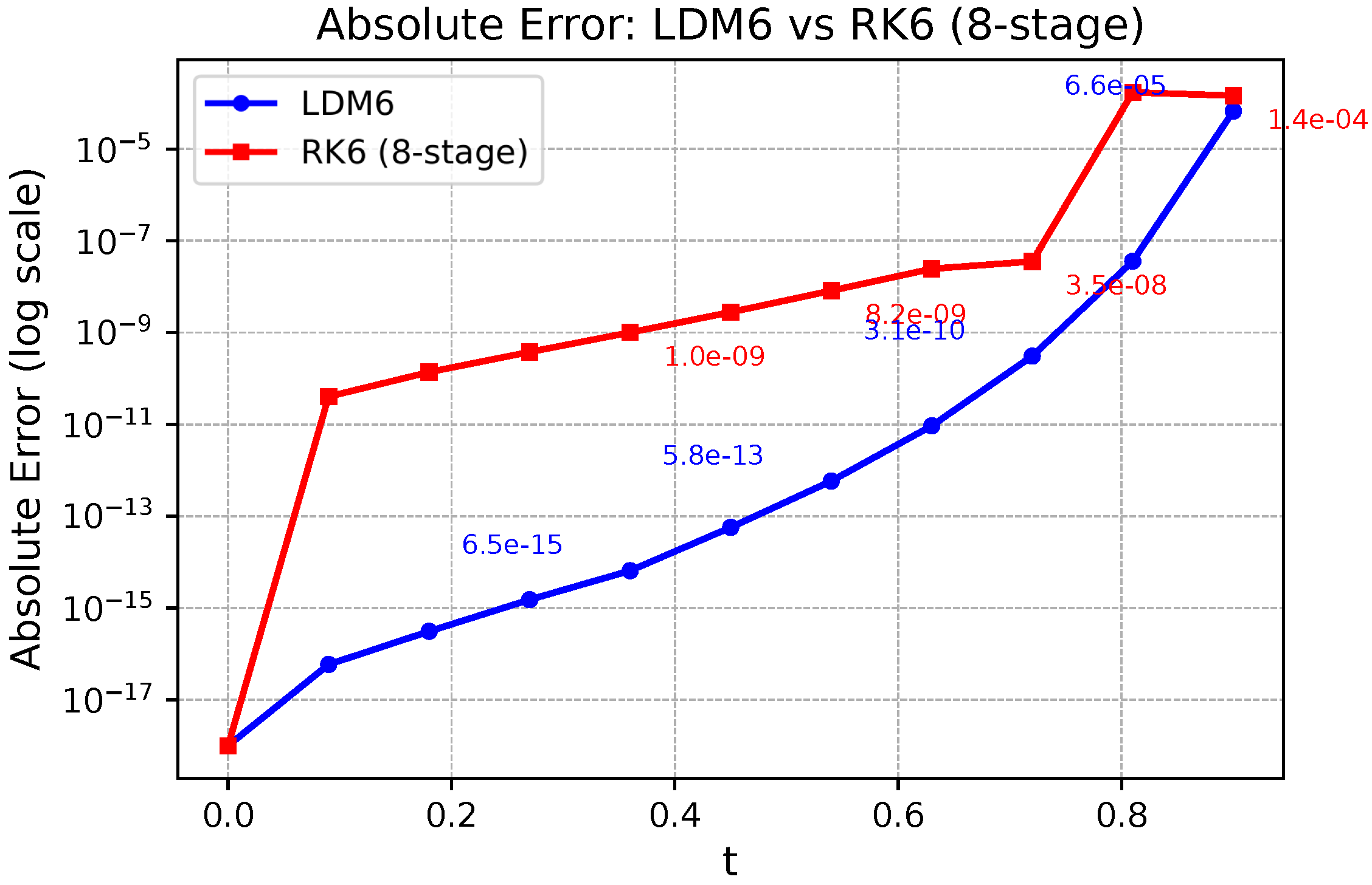 , meaning LDM6 is approximately nine orders of magnitude more accurate than RK6 (8-stage) for the same problem and step size. Such a dramatic improvement underscores the superior error control, high-order accuracy, and smooth behavior of the LDM6 scheme, especially in applications demanding extreme precision.