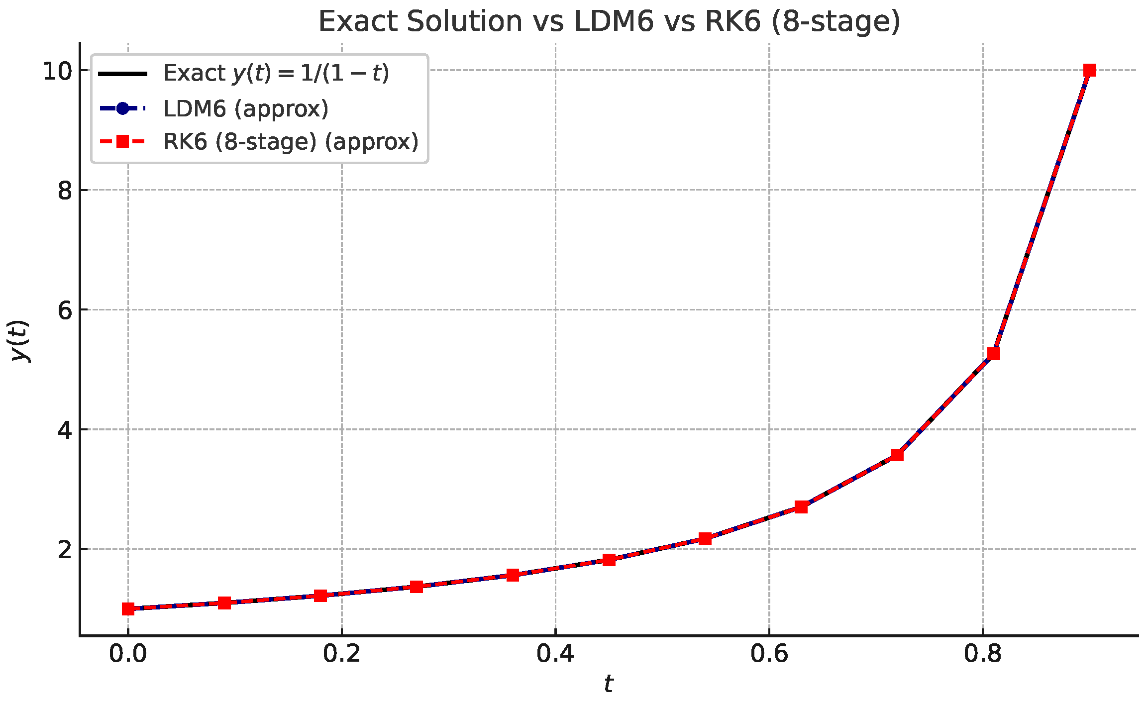, while the RK6 error has grown several orders of magnitude larger. These results imply that LDM may possess inherent accuracy advantages—possibly due to higher-order convergence or structural alignment with the underlying solution. Additionally, LDM demonstrates consistent error control and robust numerical stability throughout the whole evaluation steps, in contrast to the monotonic error growth observed in RK6. These outcomes highlight LDM as a reliable and highly precise alternative for solving initial value problems.