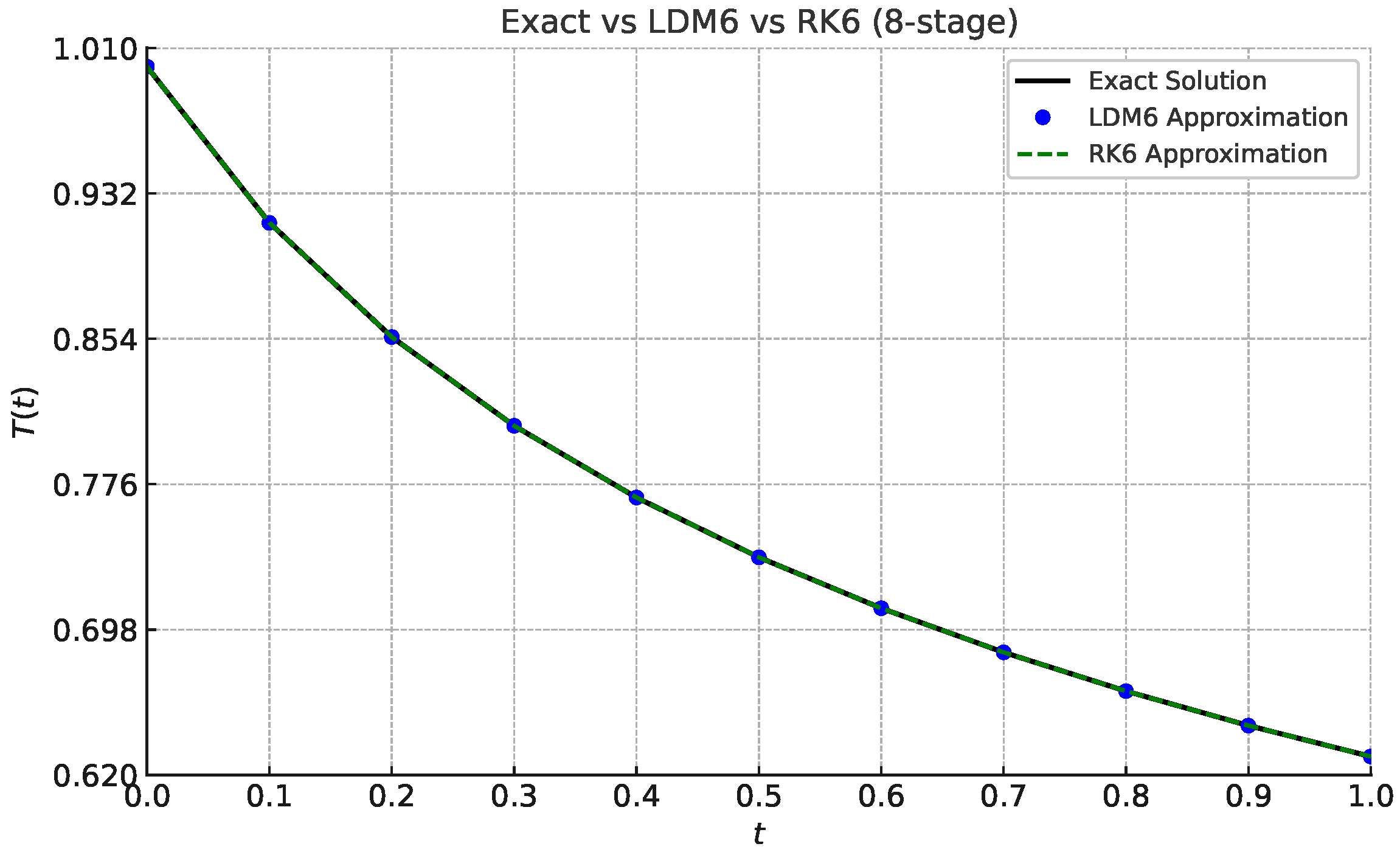 Section 6 presents numerical experiments applying the LDM to two representative nonlinear IVPs, including a radiative cooling-type equation with a known exact solution. These examples serve to validate the theoretical order of convergence and demonstrate the method’s high precision and efficiency compared to the classical Runge–Kutta method of order six (RK6 with eight stages).