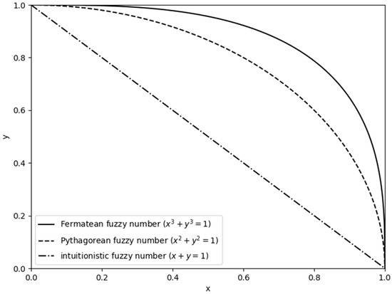 Scholars have conducted extensive research on TSM decision-making based on diverse preference types, including ordinal preferences, fuzzy preferences, linguistic preferences, and multi-form preferences. In terms of ordinal preferences, Yue [21] proposed a satisfied TSM decision-making method under completely strict preference ordinals, uncertain preference ordinals, and incomplete preference ordinals. Liang et al. [22] developed a multi-objective satisfied and stable TSM decision-making method under strong preference ordinals, weak preference ordinals, indifference preference ordinals, and unknown preference ordinals. Due to the uncertainty and fuzziness of preferences, fuzzy set theory is introduced into TSM decision-making problems. The notion of fuzzy set was initially proposed by Zadeh [23] and was subsequently expanded into different forms, such as intuitionistic fuzzy sets (IFSs) [24], interval-valued intuitionistic fuzzy sets (IVIFSs) [25], Pythagorean fuzzy sets (PFSs) [26], Fermatean fuzzy sets (FFSs) [27], picture fuzzy sets (PFSs) [28], q-rung orthopair fuzzy sets (q-ROFSs) [29], etc. These extensions can mainly be divided into two classes: extensions with two independent membership parameters and extensions with three independent membership parameters [30]. In IFSs, membership degree and non-membership degree are employed to separately represent the degree of support and opposition toward a specific attribute. For example, an intuitionistic fuzzy number (IFN) means that “in a vote on a particular attribute, 6 out of 10 participants support it, 3 oppose it, and 1 abstains”. However, IFSs are constrained by the condition that the sum of membership and non-membership degrees must not exceed 1. PFSs relax this constraint to allow the sum of membership and non-membership degrees to exceed 1, provided that the sum of their squares is no greater than 1. In comparison to IFSs and PFSs, FFSs further expand the feasible domain by permitting the sum of the squares of membership and non-membership degrees to exceed 1 while requiring the sum of their cubes to be less than 1. This expanded constraint enables FFSs to capture higher levels of uncertainty and address stronger fuzziness in practical decision-making scenarios. Figure 1 illustrates the range of the Fermatean fuzzy number (FFN), Pythagorean fuzzy number (PFN), and intuitionistic fuzzy number (IFN).