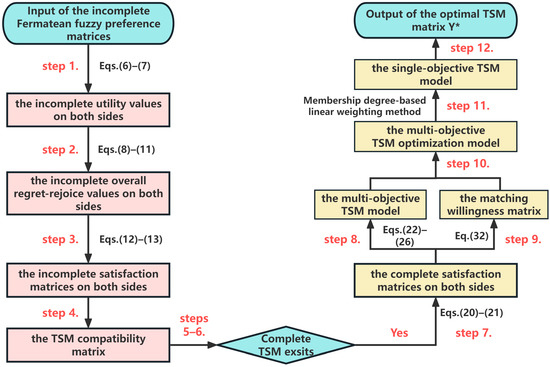 In this section, we propose an approach for incomplete Fermatean fuzzy preference TSM decision-making, in which the regret aversion psychological behavior and the matching willingness of bilateral agents are taken into account. The main procedures of this proposed approach are shown as follows. Firstly, based on the incomplete Fermatean fuzzy evaluation information, the incomplete overall regret–rejoice values on two sides are calculated. After standardization, the incomplete satisfaction degrees on two sides are further obtained. Secondly, a preliminary compatibility verification is conducted to confirm the existence of a complete TSM. When a complete TSM exists, the incomplete satisfaction degrees are transformed into the complete satisfaction degrees, and fairness-aware matching willingness factors are calculated. Thirdly, a TSM decision-making model considering the matching satisfaction and matching fairness is established. This model is solved by using the membership degree-based linear weighted method and the single-objective programming method, and the optimal TSM scheme can be derived.