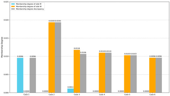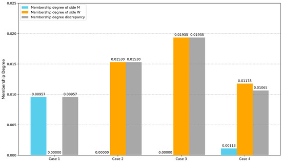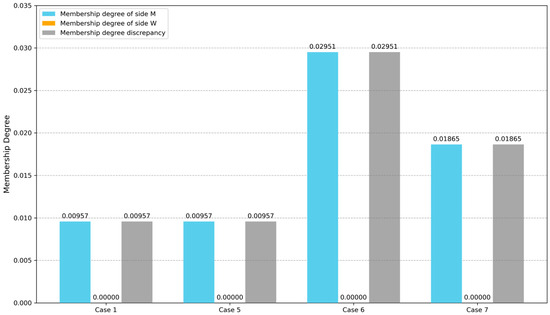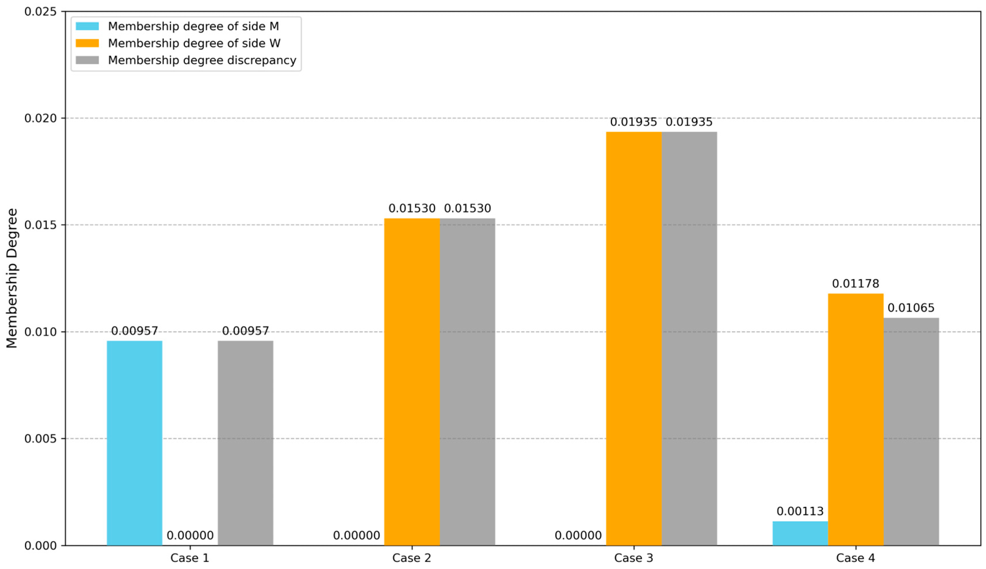 Since side W in Case 1 has already attained its single-objective optimal value, further increments in (while reducing ) trigger adjustments in the matching scheme via modifications to the matching willingness factor. Notably, this regulatory mechanism yields a gradual improvement in side M’s satisfaction—evidenced by a declining membership degree—yet preserves side W’s absolute dominance, with its satisfaction remaining consistently at the optimal level (membership degree persisting at 0).