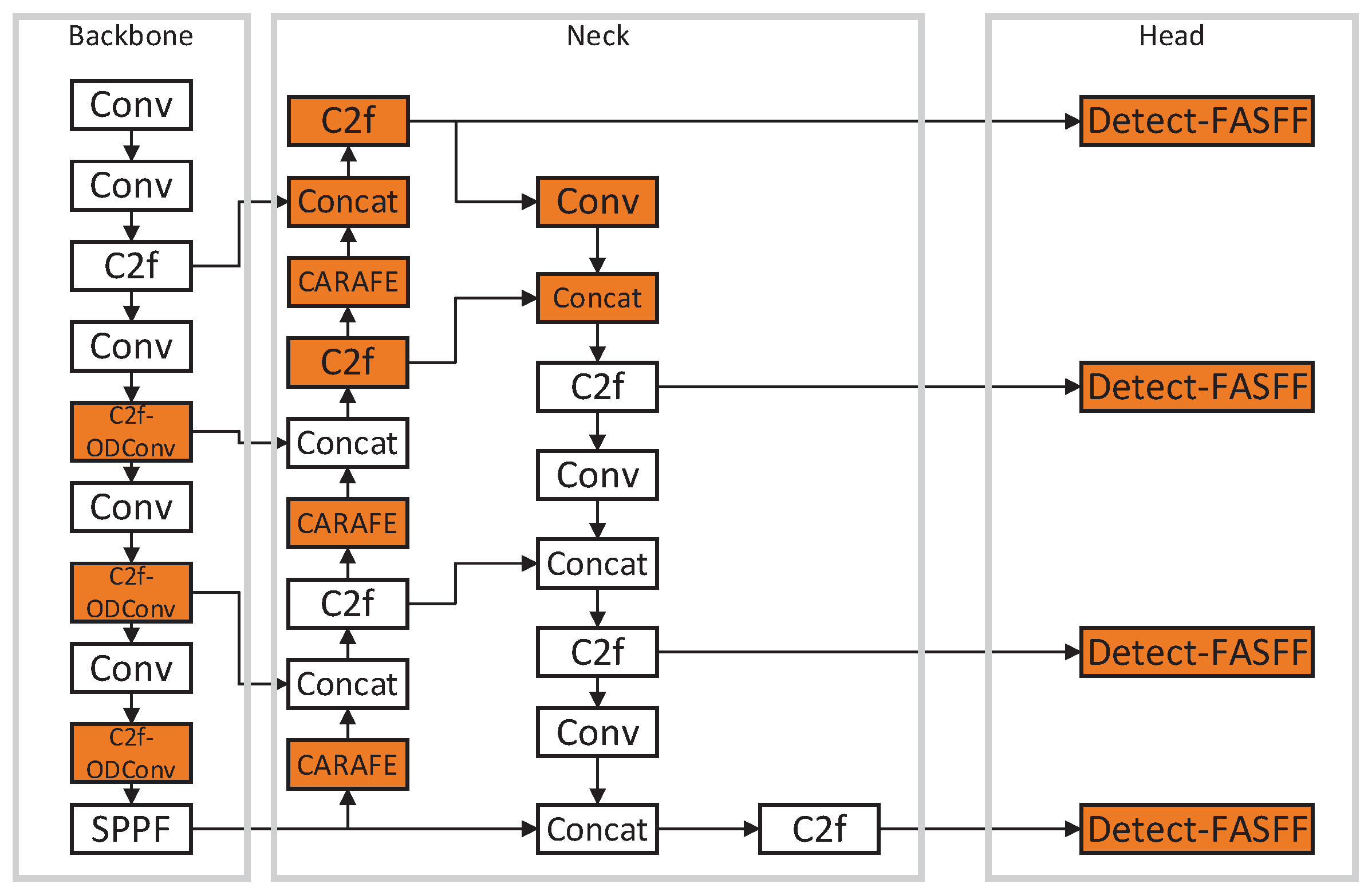 Figure 2. The orange sections indicate the improved modules. Firstly, to enhance the network’s target perception capability during feature extraction, we propose the C2f_ODConv module, which replaces the last three C2f modules in YOLOv8’s backbone network. To ensure accurate feature extraction across multi-scale input data while meeting the diverse feature requirements for dense pedestrians in complex environments, the model enhances its cross-scale perception and feature extraction capabilities for pedestrian global contextual information. Consequently, the network can carry out accurate feature extraction for different input data characteristics. This, in turn, meets the diversified dense pedestrian environments and enhances the model’s ability of multi-scale perception and characterization of the pedestrians’ global contextual information. Secondly, the original sampling operator is replaced by the CARAFE up-sampling operator, which exhibits a broader receptive field. This architectural substitution enables the model to leverage semantic information from feature maps, thereby enhancing the neck network’s capability in both feature extraction and fusion. Simultaneously, we replace the detection head with the Adaptive Spatial Feature Fusion detector head with ASFF-4 module, which facilitates adaptive weight learning for spatial feature fusion to address cross-scale discrepancies, ultimately improving detection accuracy. Finally, the Focaler-Shape-IoU is employed as the loss function for bounding box regression. This advanced loss function is designed to address three key aspects: (1) minimizing the influence of low-quality samples on anchor box regression, (2) accelerating model convergence rate and (3) significantly improving detection precision for small-scale targets.