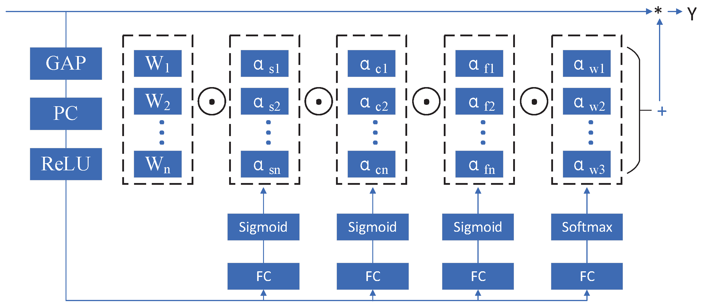 Figure 3. The input feature X is compressed into a feature vector through Global Average Pooling (GAP). Subsequently, this vector is mapped to a low-dimensional space via a Fully Connected (FC) layer, with negative values being zeroed out by the ReLU activation function. Finally, the processed feature vector is distributed to four parallel computational branches. The four branches, each processed through a fully connected (FC) layer followed by a Sigmoid activation function, enable the initial three branches to capture attention to scalars for three key convolutional kernel attributes: spatial dimensions, input channels and output channels, respectively. The final branch derives attention to scalars along the kernel’s channel-count dimension. Finally, the attention scalars from all four dimensions are convolved with the input features X to generate the output features Y.