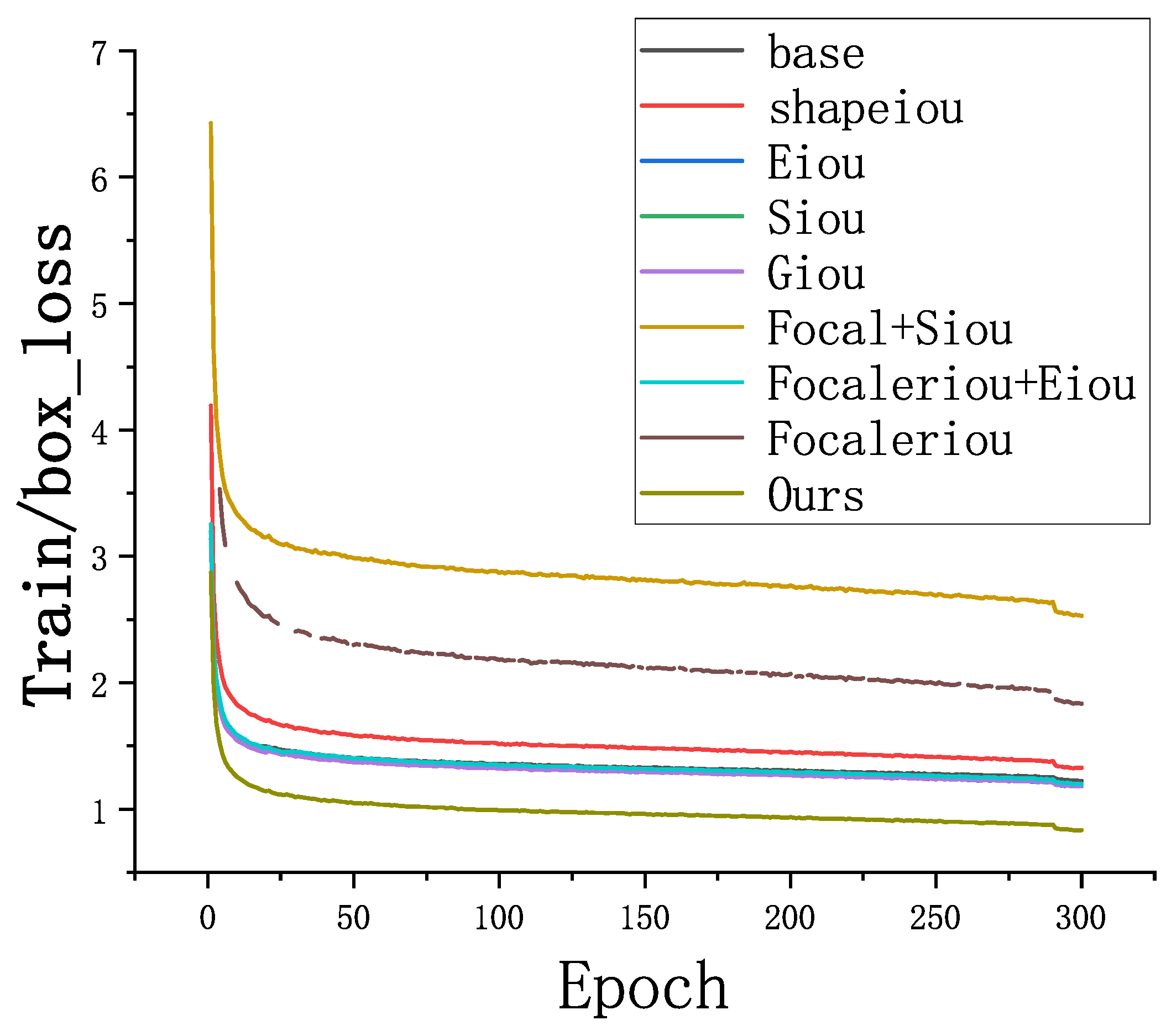 Figure 8) more intuitively show that the curve corresponding to Focaler-Shape-IoU has a faster decreasing speed of bounding box loss during the training process; also, with the increase in the number of training epochs, in the later stage of training the loss value is significantly lower than that of other compared loss functions. As is well known, the lower the bounding box loss, the higher the accuracy of the model’s prediction for the target bounding box. From the perspective of gradient stability, Focaler-Shape-IoU effectively avoids the issues of gradient explosion and vanishing by optimizing the mathematical form of the loss function, thereby ensuring smoother gradient updates during the training process. In terms of sample difficulty modeling, a dynamic sample difficulty perception mechanism is introduced. It can accurately distinguish the difficulty and ease levels of samples, assigning higher loss weights to deal with the difficult samples and enhance the model’s ability for the learn objects in complex scenarios. Therefore,