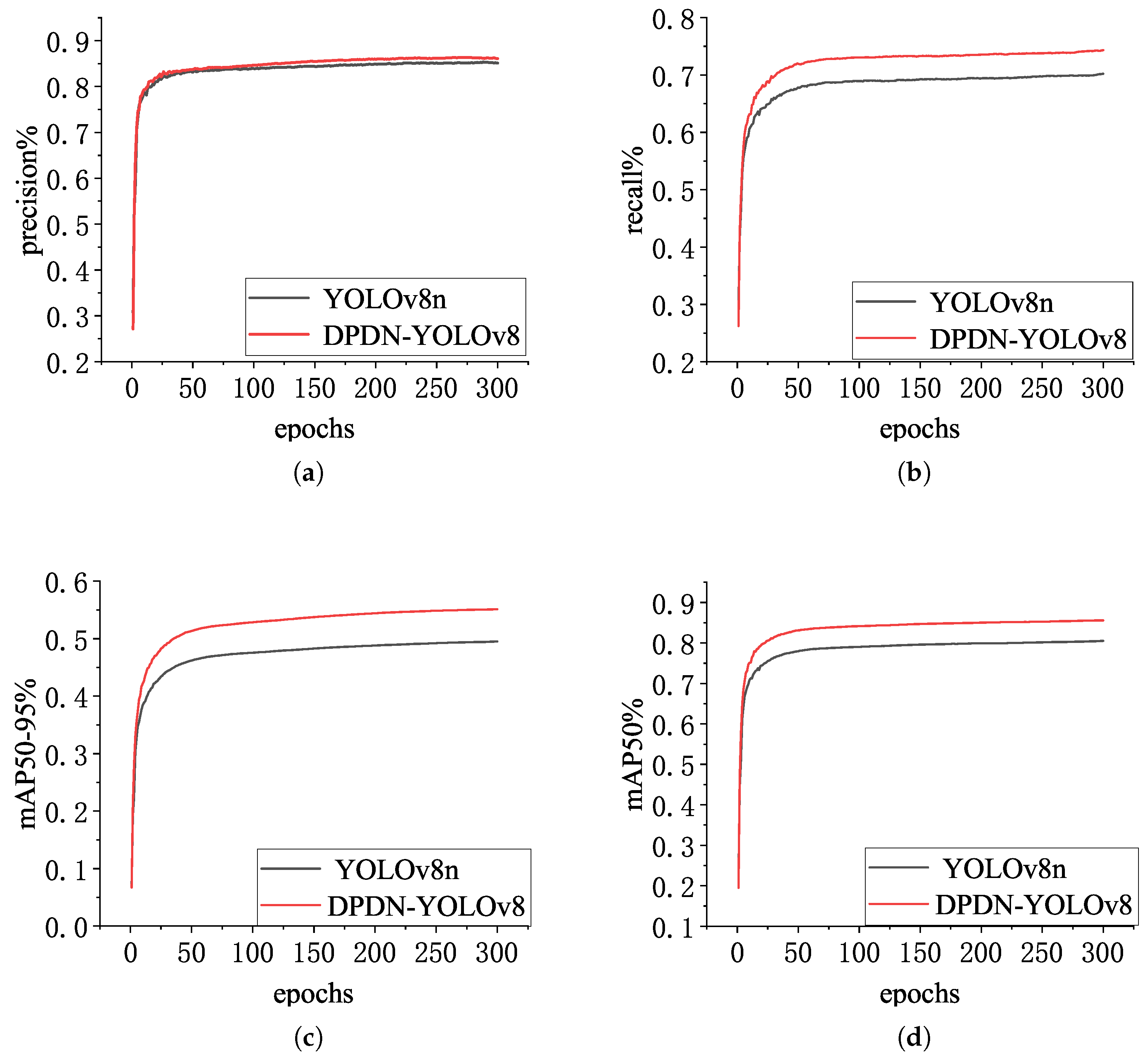 To further validate the performance of the DPDN-YOLOv8 model, both YOLOv8n and DPDN-YOLOv8 models were trained on the CrowdHuman dataset. A comparative analysis was conducted on the training results, evaluating four key metrics: precision, recall, mean Average Precision at IoU = 0.5 (mAP@0.5) and mean Average Precision over IoU thresholds from 0.5 to 0.95 (mAP@0.5:0.95).