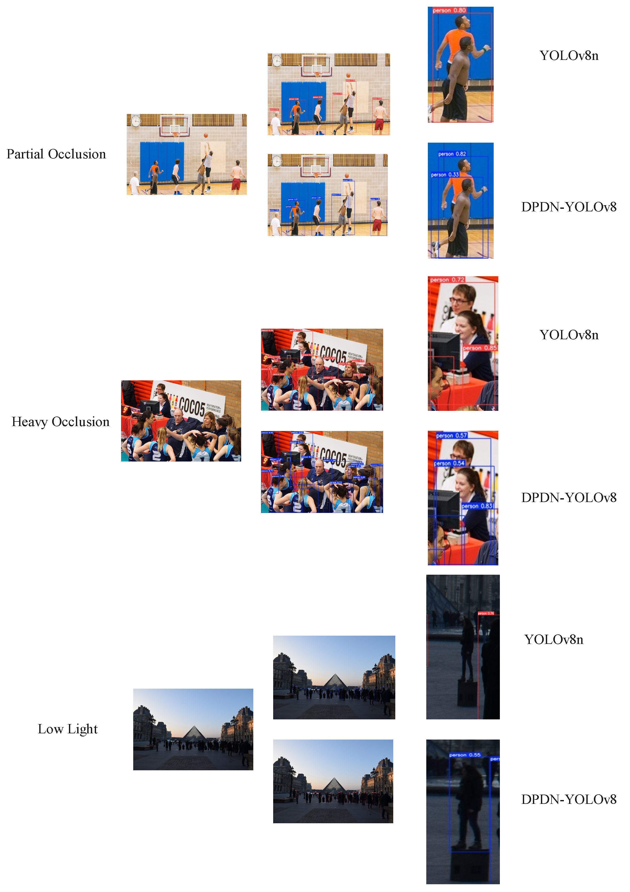Figure 10. The detection results of YOLOv8n and DPDN-YOLOv8 in three challenging scenarios are compared: partial occlusion, heavy occlusion and low light. In partial occlusion, DPDN-YOLOv8 can more accurately detect occluded targets with precise bounding boxes and high confidence. For heavy occlusion, it outperforms YOLOv8n by effectively identifying pedestrians with only partial features exposed, reducing missed detections. In low-light environments, DPDN-YOLOv8 also demonstrates strong adaptability, stably detecting pedestrians with reliable bounding boxes and confidence scores. Overall, DPDN-YOLOv8 exhibits excellent advantages: superior occlusion resistance, strong adaptability to low-light conditions and higher detection accuracy and confidence, making it more robust in complex scenarios.