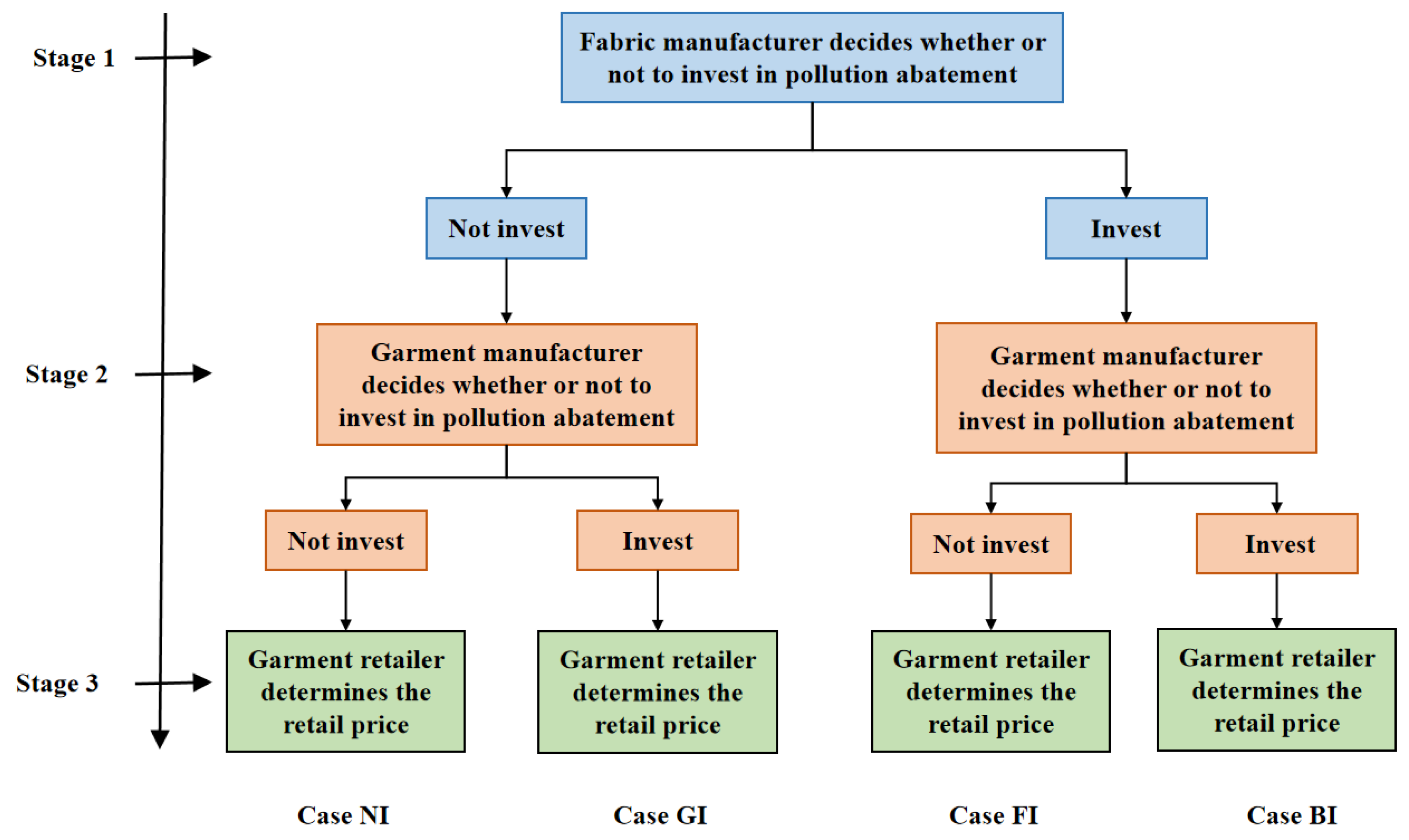 This study examines four pollution abatement scenarios based on by the manufacturers’ investment choices: No Investment (NI), Fabric Manufacturer Investment (FI), Garment Manufacturer Investment (GI), and Both Investment (BI). Figure 1 provides a detailed depiction of these scenarios. In each scenario, the sequence of events unfolds as follows: