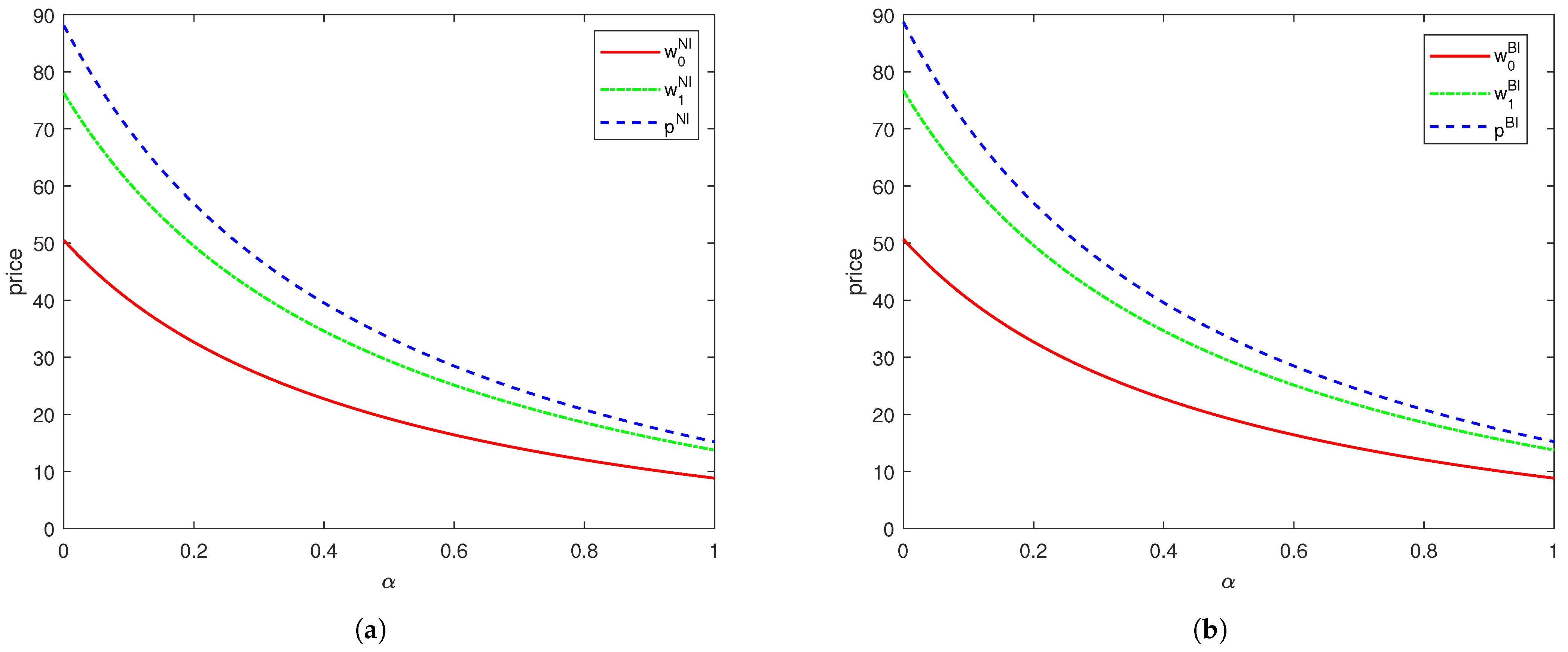 Figure 3. The wholesale and retail prices. (a) Under case NI. (b) Under case BI.