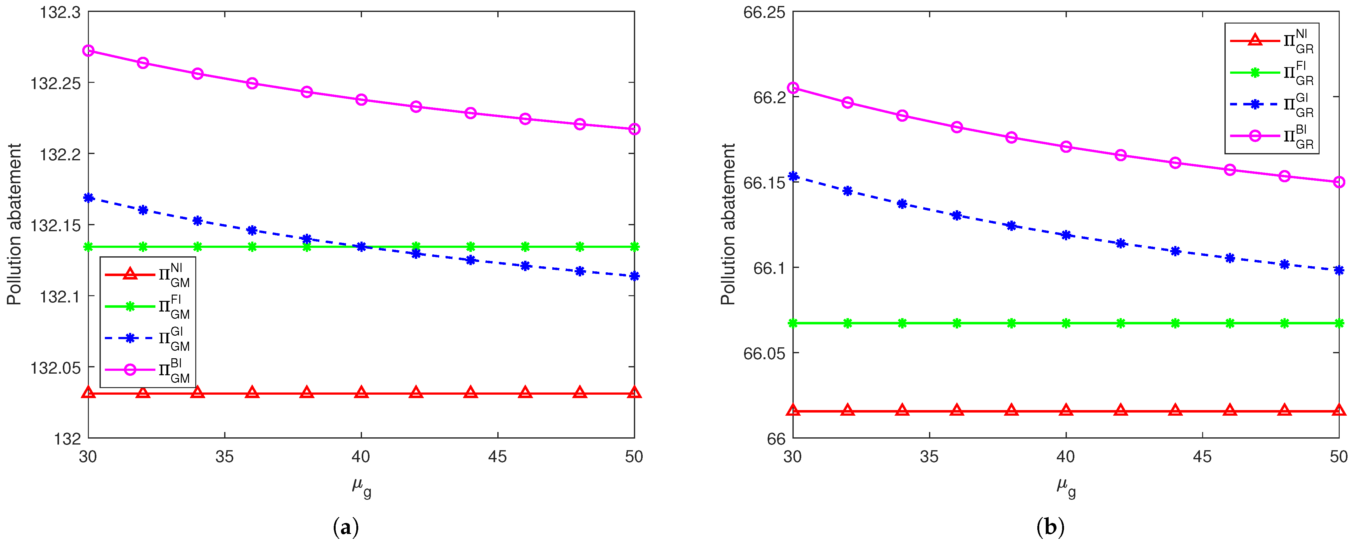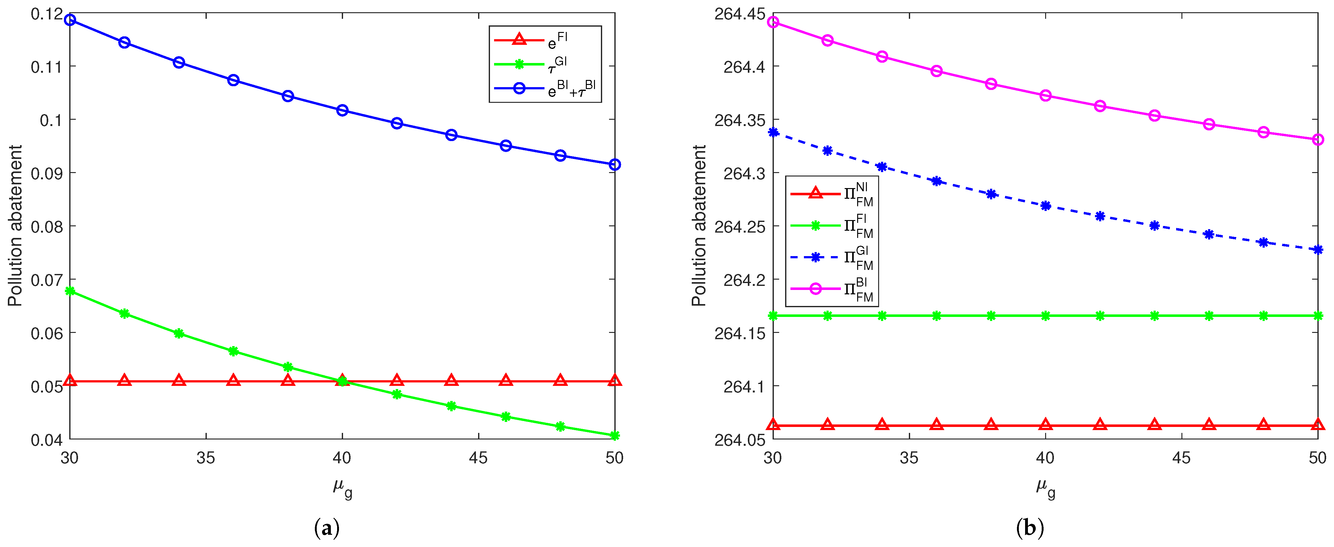 Figure 2. The pollution abatement level under different cases. (a) When u f = 40 > u g = 30 . (b) When u f = 40 < u g = 50 .