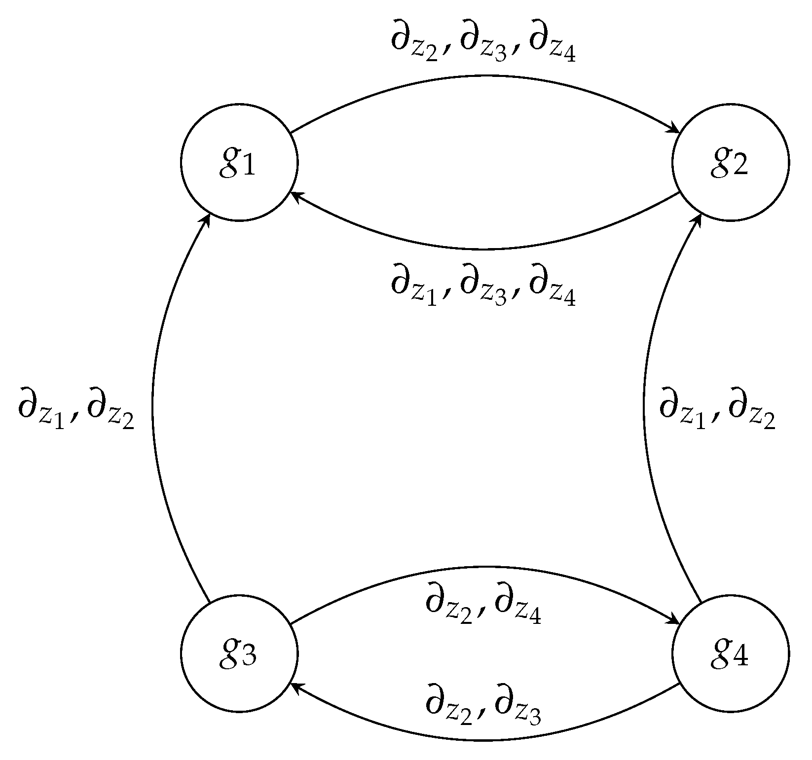 Edges label which derivatives link which components: for instance,