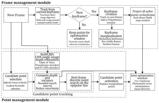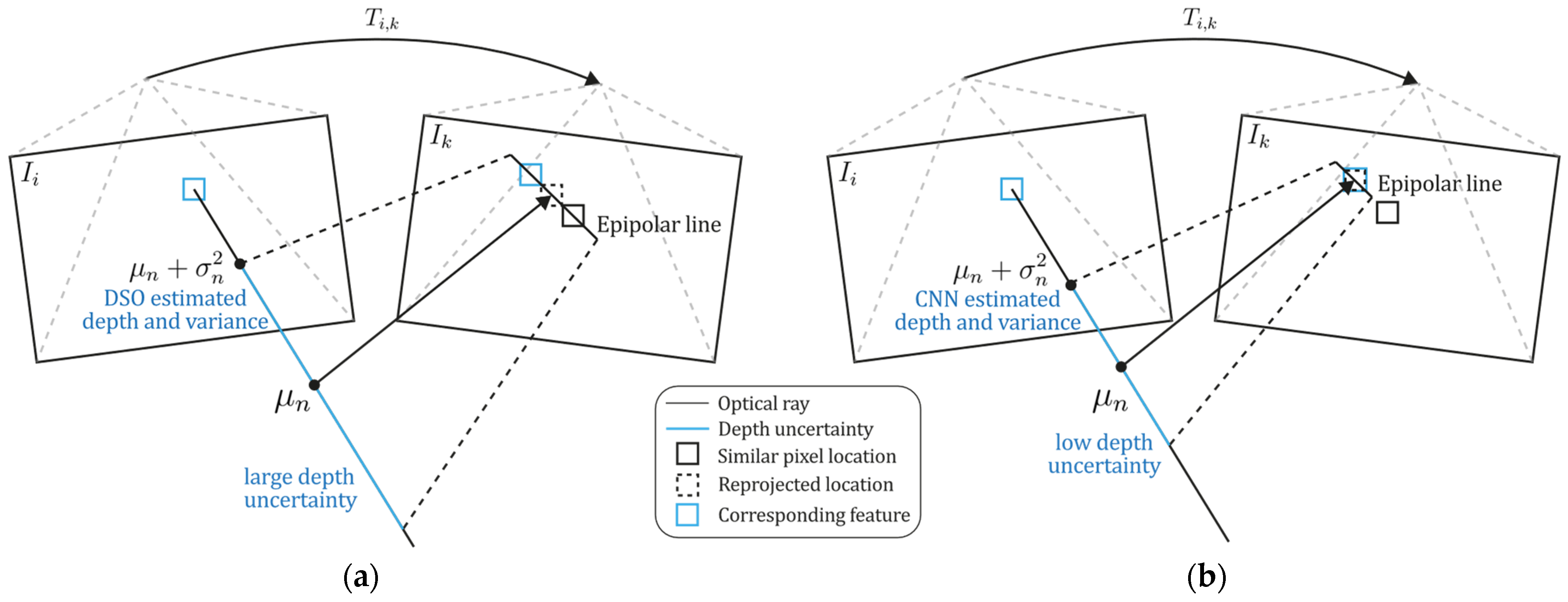 - Cheng, R.; Agia, C.; Meger, D.; Dudek, G. Depth Prediction for Monocular Direct Visual Odometry. In Proceedings of the 2020 17th Conference on Computer and Robot Vision (CRV), Ottawa, ON, Canada, 13–15 May 2020; IEEE: Piscataway, NJ, USA, 2020; pp. 70–77. [Google Scholar] [CrossRef]