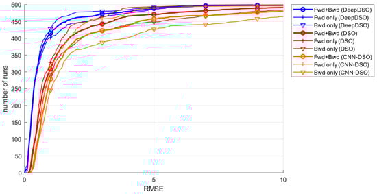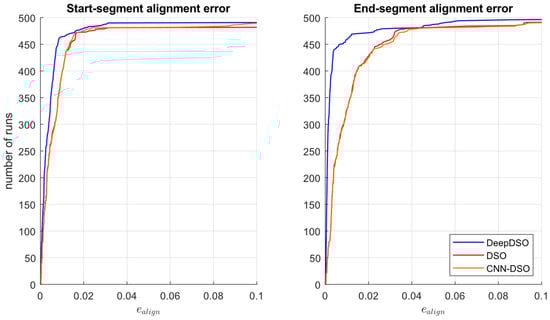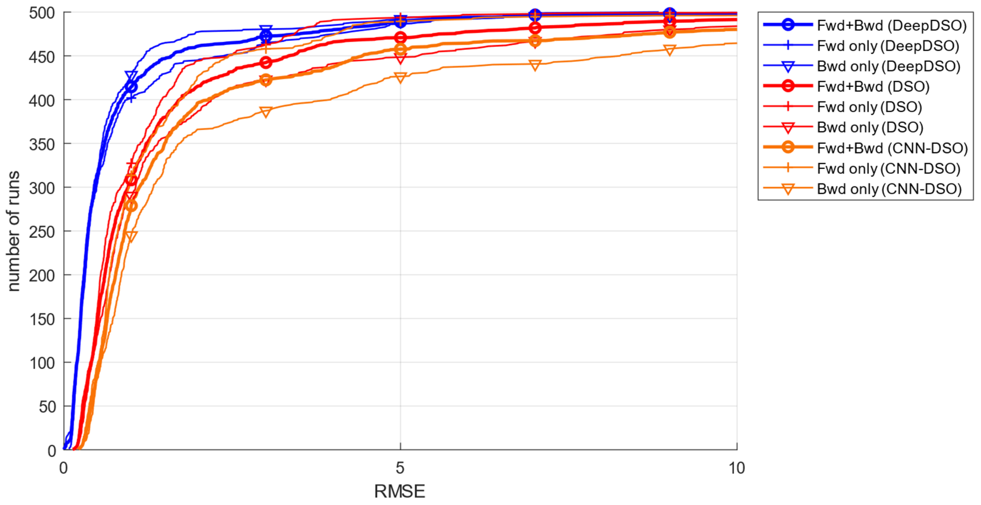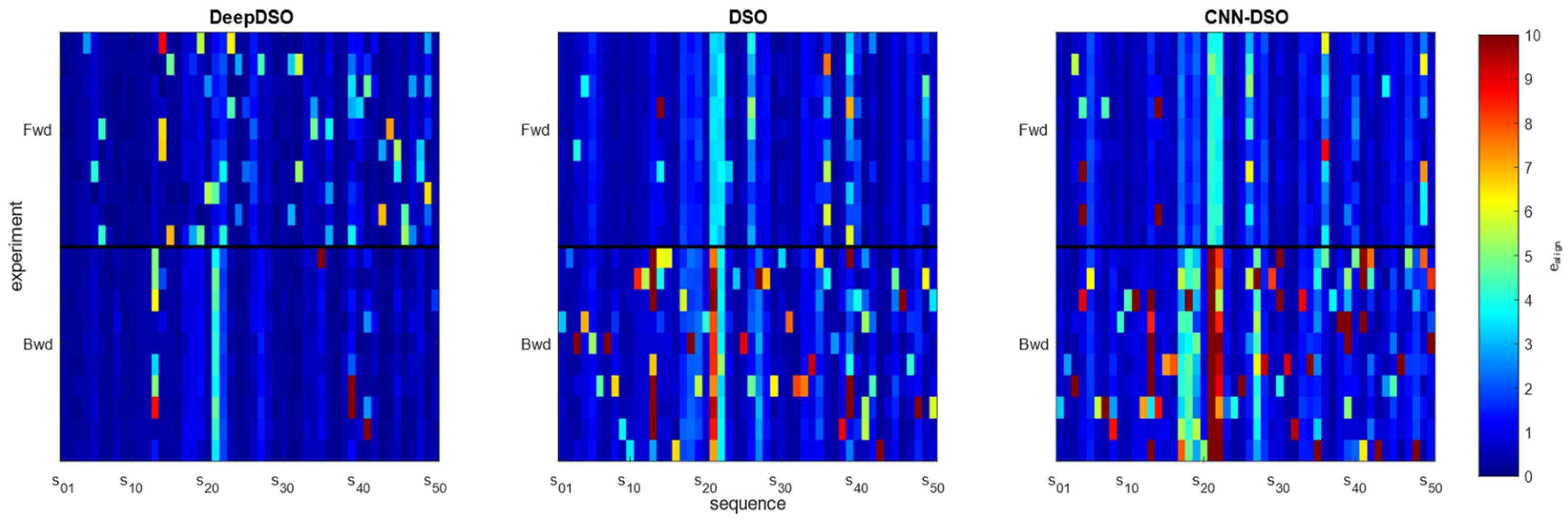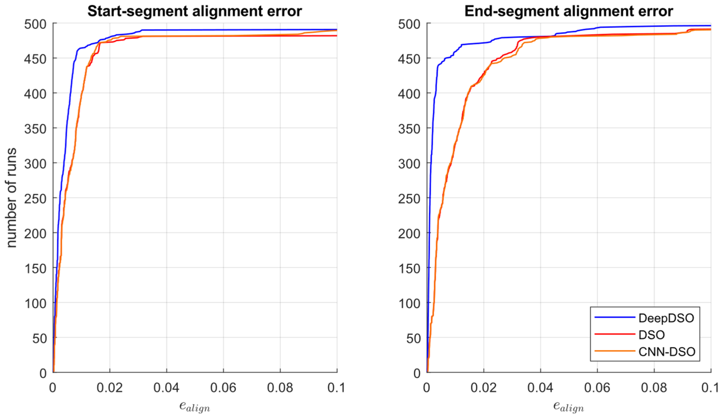 - Translational RMSE: The TUM-Mono benchmark authors also established a metric that equally considers translational, rotational, and scale effects. This metric, named alignment error (), can be computed for the start and end segments. Furthermore, when calculated for the combined start and end segments, is equivalent to the translational RMSE:where are the estimated tracked positions for the to frames, and are the frame indices corresponding to the start- and end-segments for the ground truth positions . As can be seen, the TUM-Mono benchmark is ideal for monocular comparisons, particularly for sparse-direct systems. This is because the benchmark was entirely acquired using monocular cameras and the ground truth was registered by a monocular SLAM system. Additionally, it enables the comparison of SLAM and VO systems from multiple dimensions, both separately and in conjunction. For this reason, we used this benchmark to test the performance of our DeepDSO proposal.