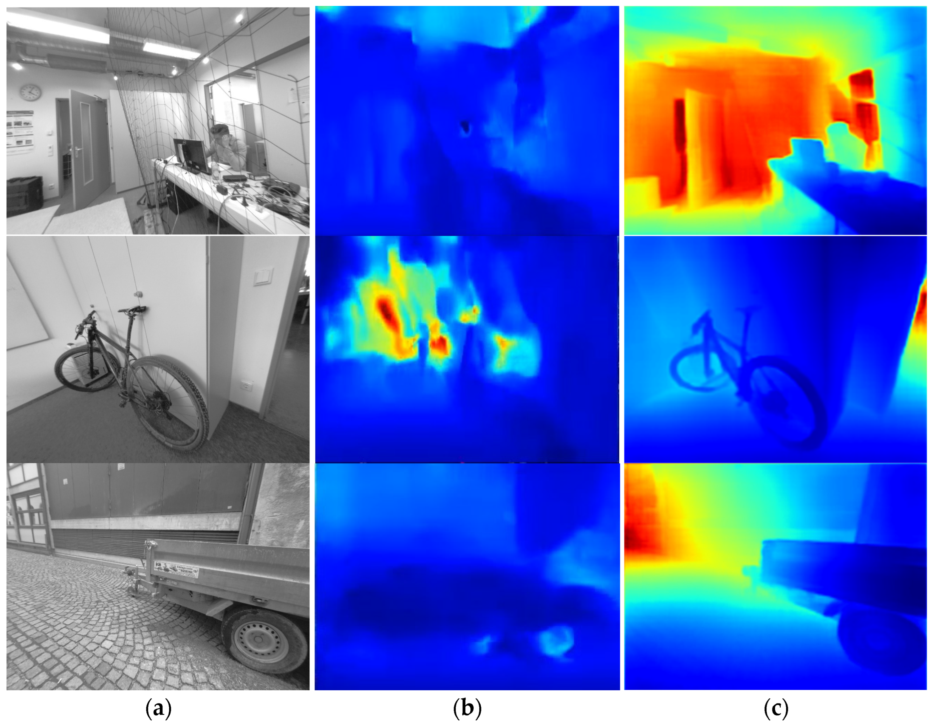 - Godard, C.; Mac Aodha, O.; Firman, M.; Brostow, G. Digging into Self-Supervised Monocular Depth Estimation. In Proceedings of the 2019 IEEE/CVF International Conference on Computer Vision (ICCV), Seoul, Republic of Korea, 27 October–2 November 2019; IEEE: Piscataway, NJ, USA, 2019; pp. 3827–3837. [Google Scholar] [CrossRef]