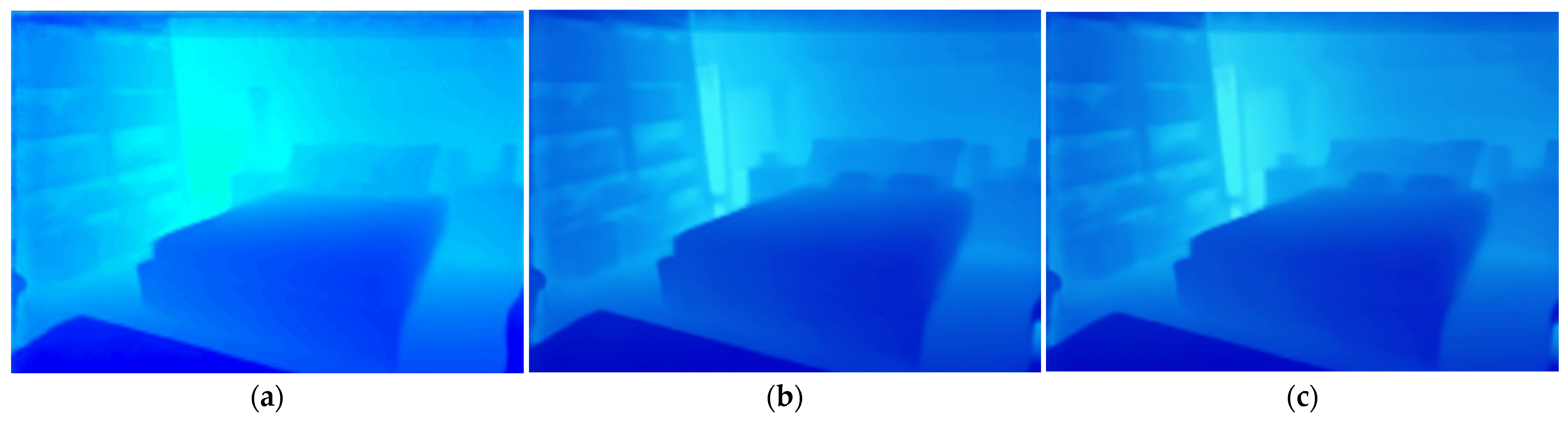 - Aich, S.; Uwabeza Vianney, J.M.; Islam, M.A.; Liu, M.K.B. Bidirectional Attention Network for Monocular Depth Estimation. In Proceedings of the 2021 IEEE International Conference on Robotics and Automation (ICRA), Xi’an, China, 30 May–5 June 2021; pp. 11746–11752. [Google Scholar] [CrossRef]