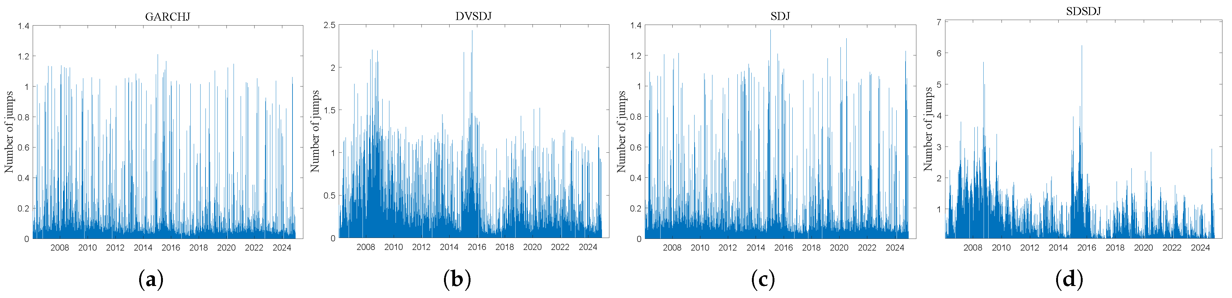 Figure 3 presents the filtered jump intensity for different GARCH-jump models. Clearly, models with dynamic jump intensity (i.e., DVSDJ and SDSDJ) provide more significant peaks than the static models (i.e., GARCHJ and SDJ). One possible reason is that static models use constant jump intensities, making it difficult to distinguish between high- and low-jump intensity trading days. However, GARCH-jump models with dynamic jump models provide better estimates of the number of posterior jumps associated with market crises.