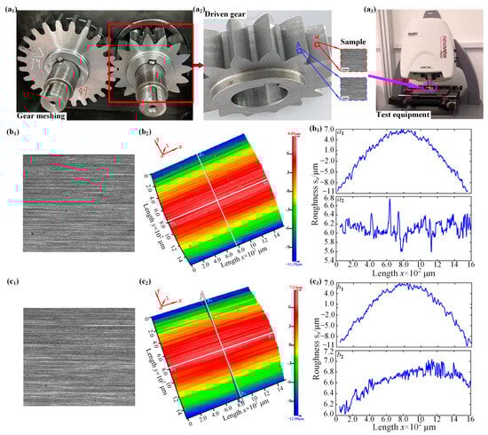 Measurement of tooth surface topography characteristic: (a1–a3) test gear and Newview 9000 3D non-contact surface morphometer; (b1–b3) sample piece, 3D gear surface topography, and profile amplitude at a point; and (c1–c3) sample piece, 3D gear surface topography, and profile amplitude at b point.