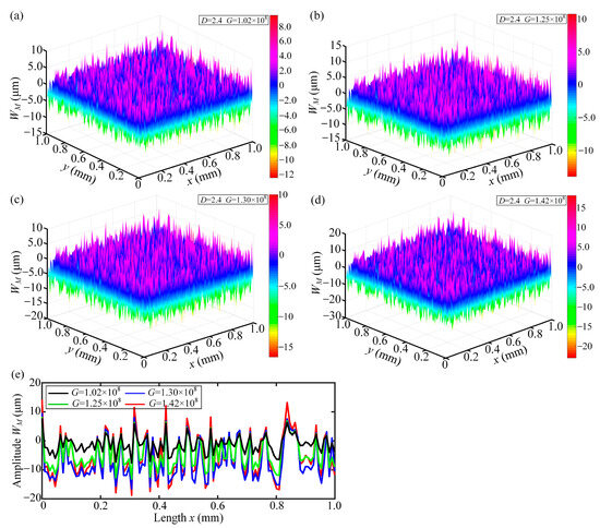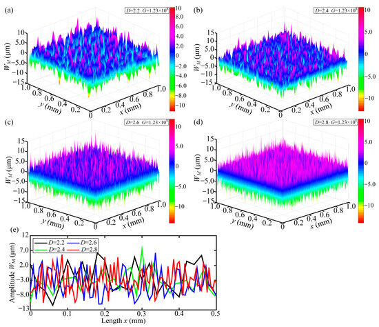The 3D tooth surface topography of spur gear for different D: (a) D = 2.2, G = 1.23 × 108, (b) D = 2.4, G = 1.23 × 108, (c) D = 2.6, G = 1.23 × 108, and (d) D = 2.8, G = 1.23 × 108. (e) Sectional view.