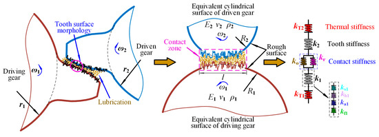 Due to the widespread application of gears in aerospace, automobiles, ships, and other high-end mechanical equipment [1,2], gear systems often operate in complex and changing environments. In addition, the concave–convex microstructure and oil film on the tooth surface directly influence the load sharing, lubrication characteristics, wear, transmission efficiency, and thermal effects between the teeth, and then affect the gear-meshing characteristics and the contact properties at the meshing interface of the gears, which further influence the vibration and noise, meshing shock, safety and reliability, and service life of the gears through stiffness and error excitations. Hence, to understand the meshing characteristics of gears under multi-physical field coupling, the calculation of the comprehensive meshing stiffness is particularly important under thermal elastohydrodynamic lubrication and has become the focus of research in the field of gear systems in recent years, which has attracted more and more scholars to investigate this [3].