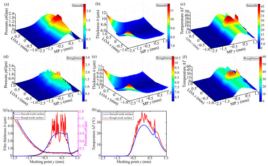 The comparison results with smooth/rough tooth surface: (a–d) 3D oil film pressure, (b–e) 3D oil film thickness, (c–f) 3D oil film temperature rise, (g) 2D oil film pressure/thickness, and (h) 2D temperature rise.