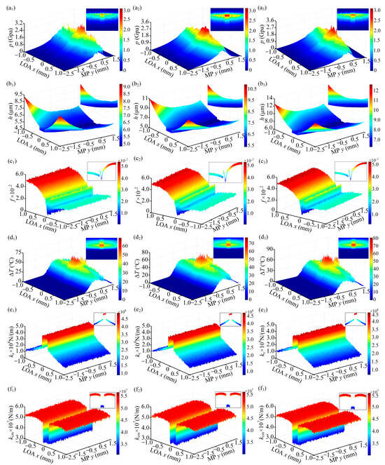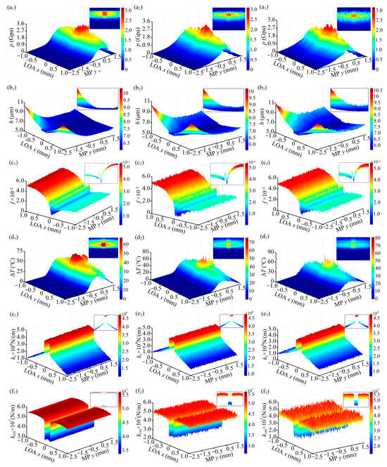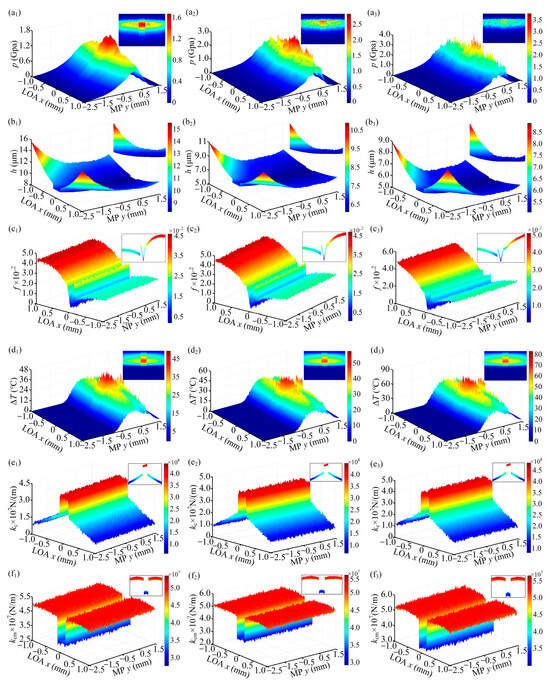 Contact and stiffness characteristics under different D: (a1–a3) 3D oil film pressure, (b1–b3) 3D oil film thickness, (c1–c3) 3D temperature rise, (d1–d3) 3D friction coefficient, (e1–e3) 3D contact stiffness, and (f1–f3) 3D comprehensive meshing stiffness.